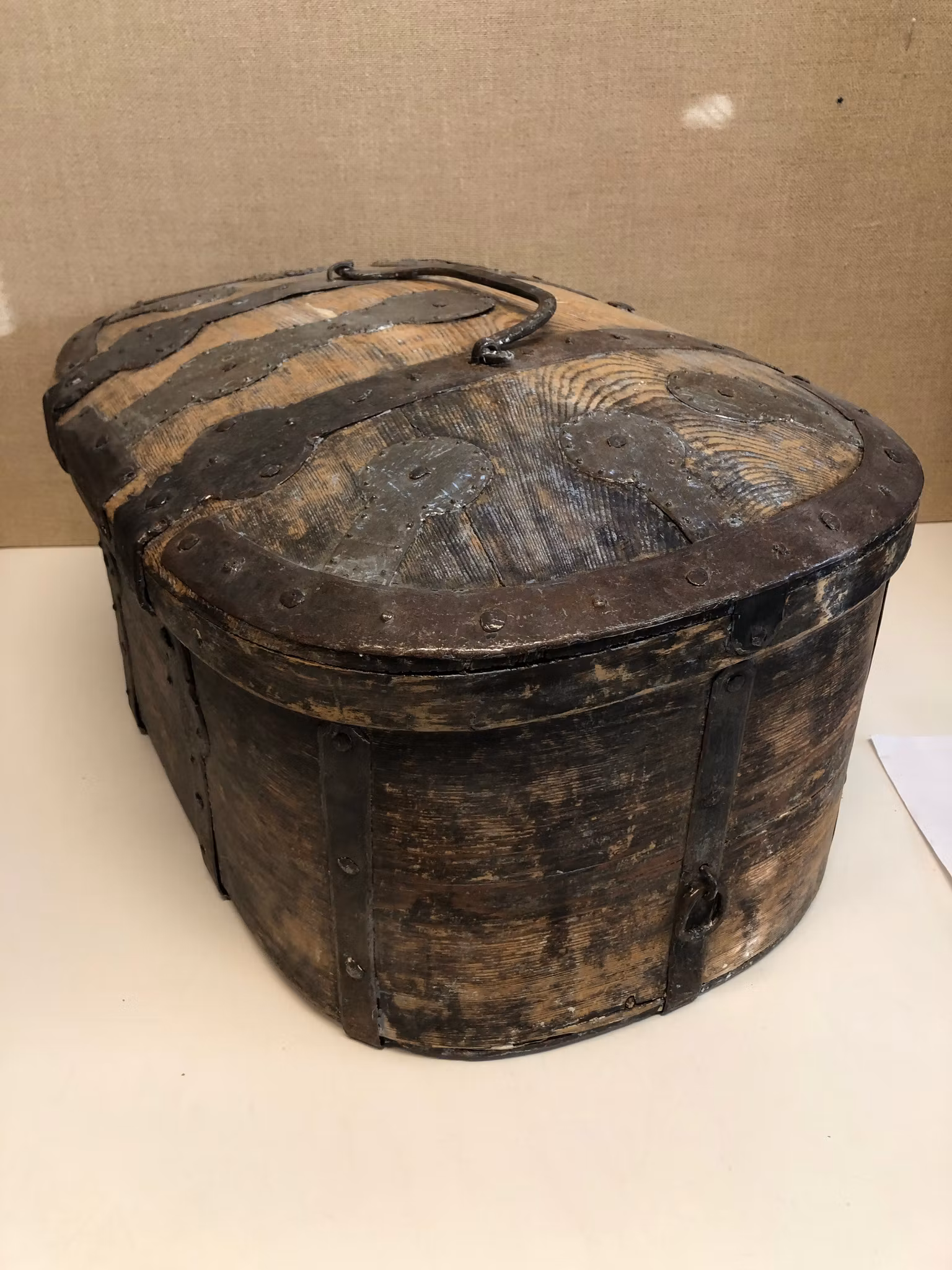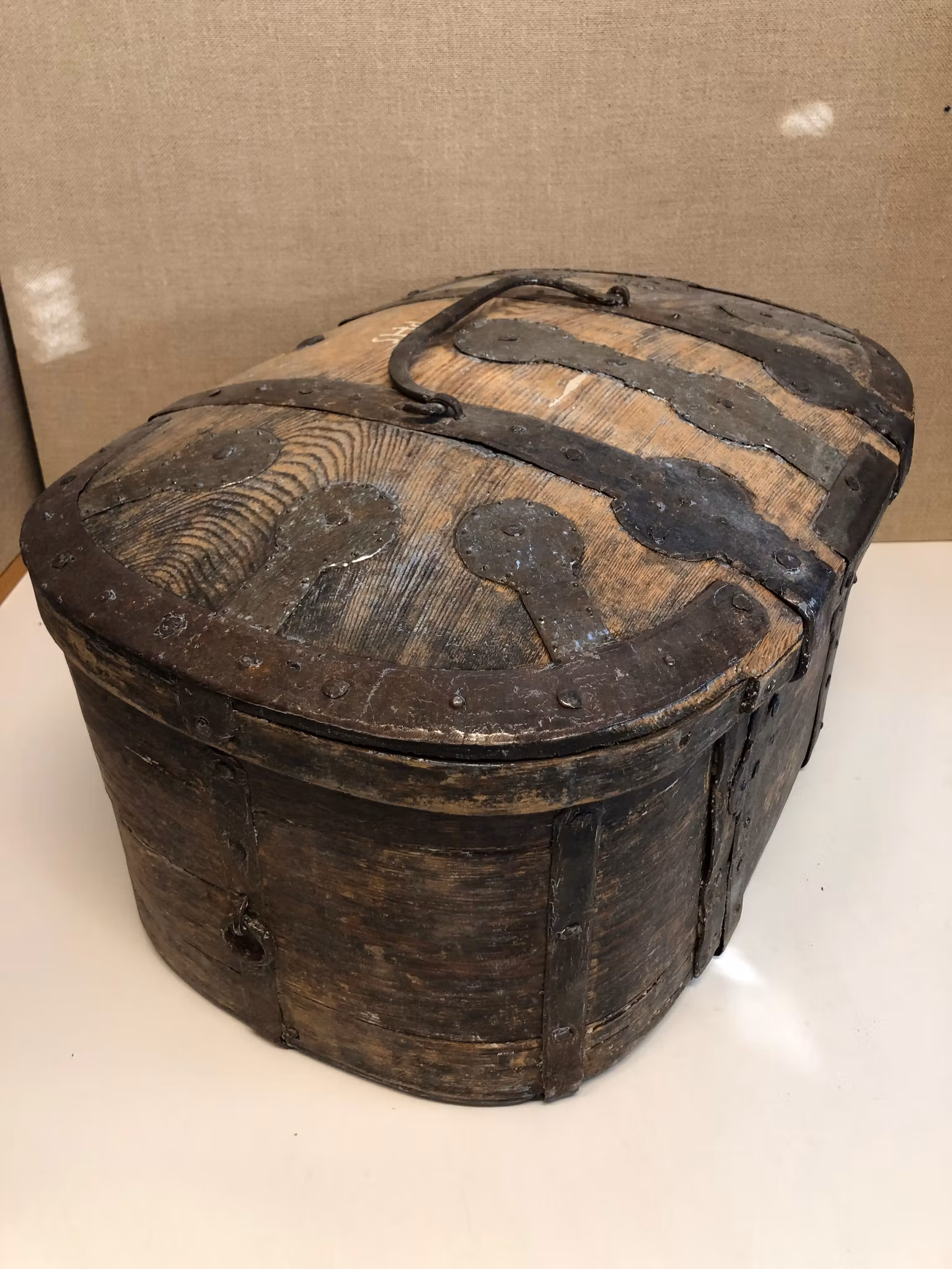 For/färdskrin i furu med smidda beslag, ägarinitialer PHS.