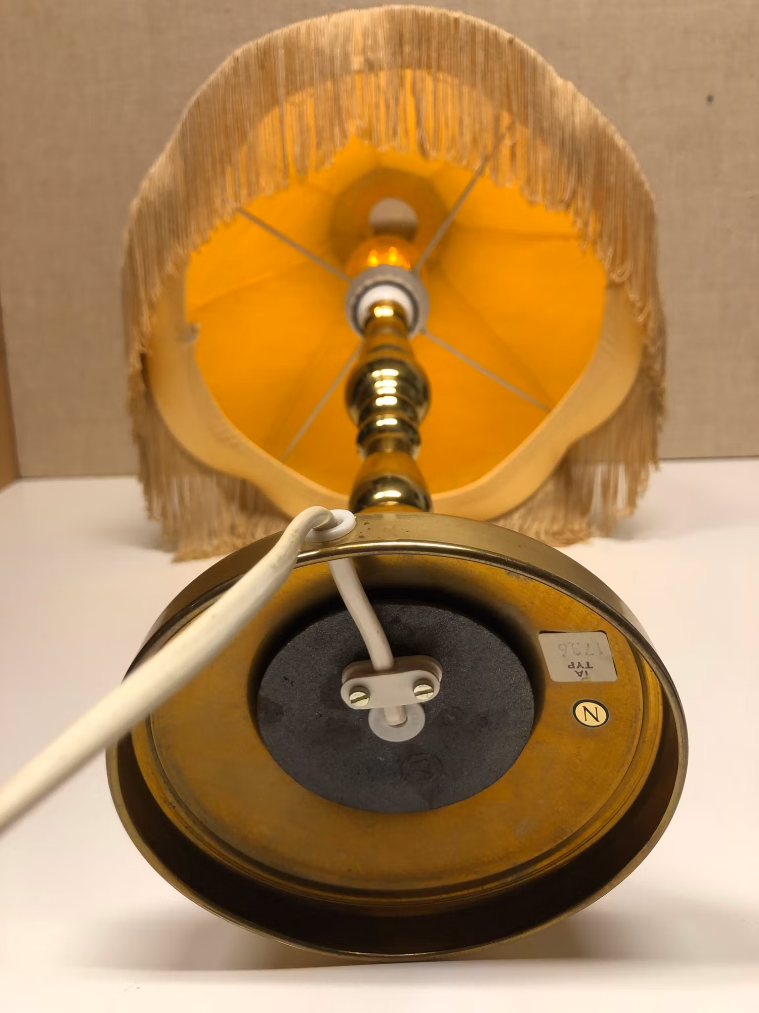 Bordslampa i mässing etikett märkt IA typ 1736, skärm med stomme i metall klädd med textil.