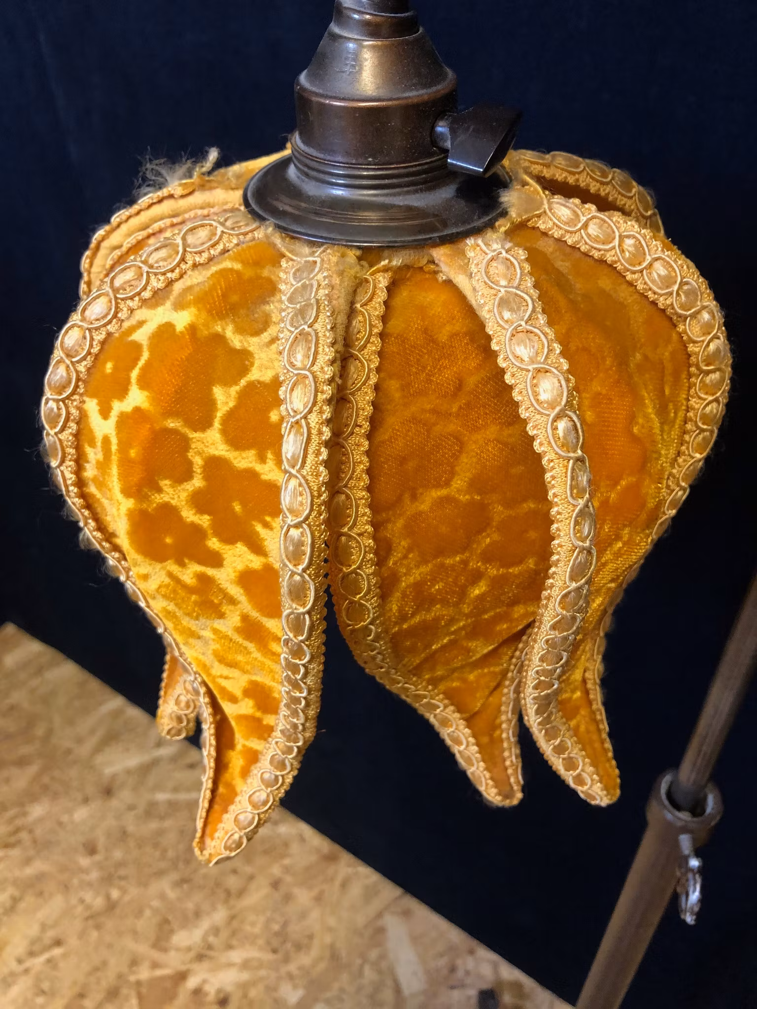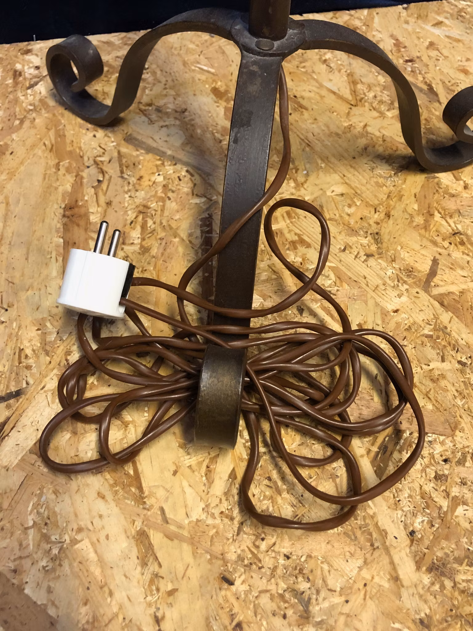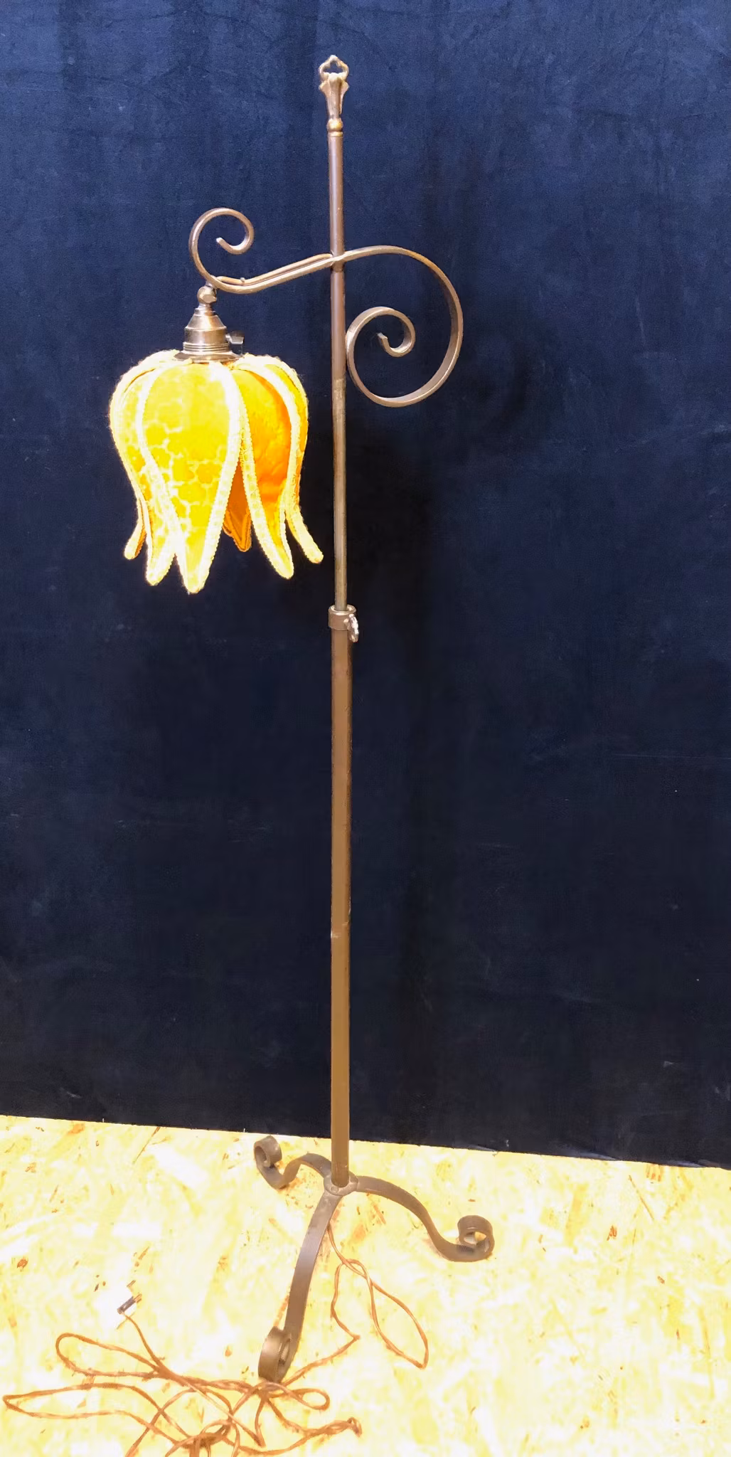 Golvlampa i smide, höj och sänkbar, lampskärm med stomme i metall klädd med textil.