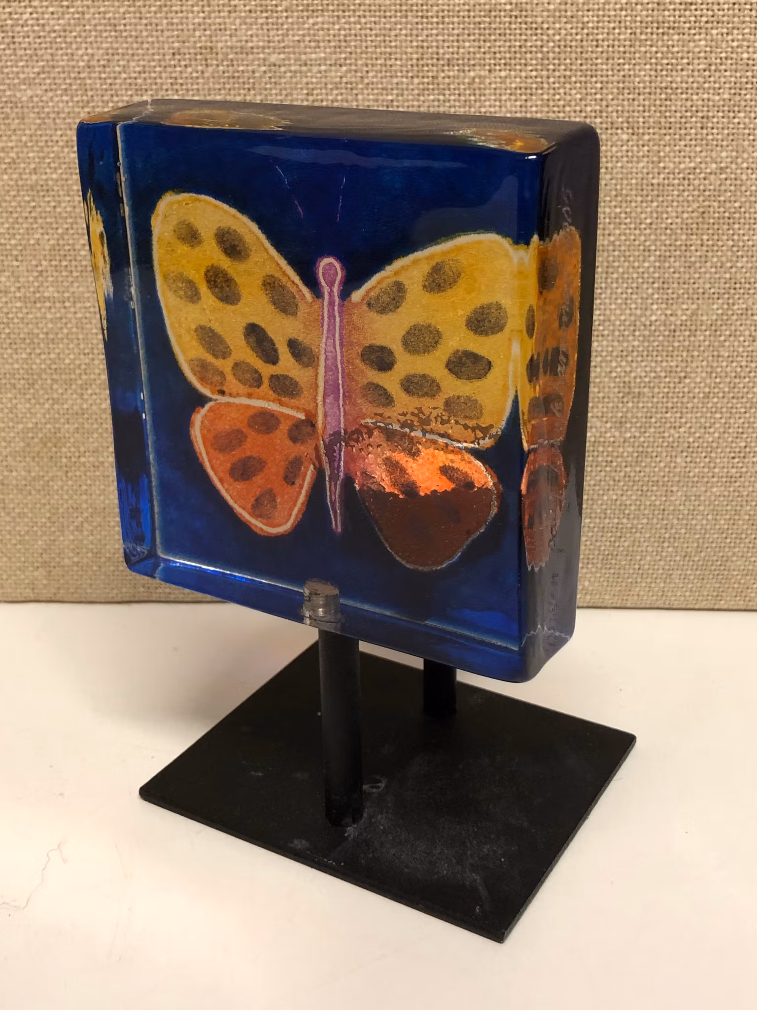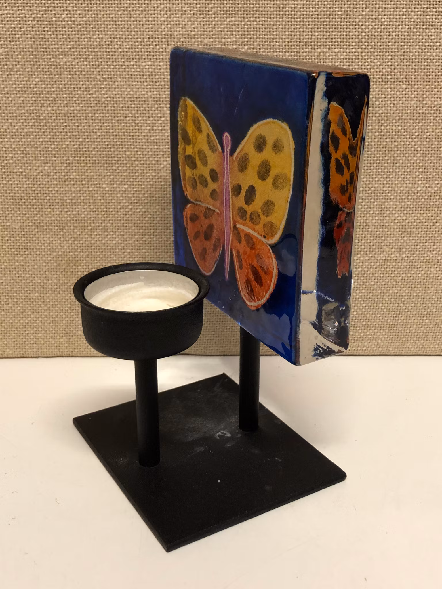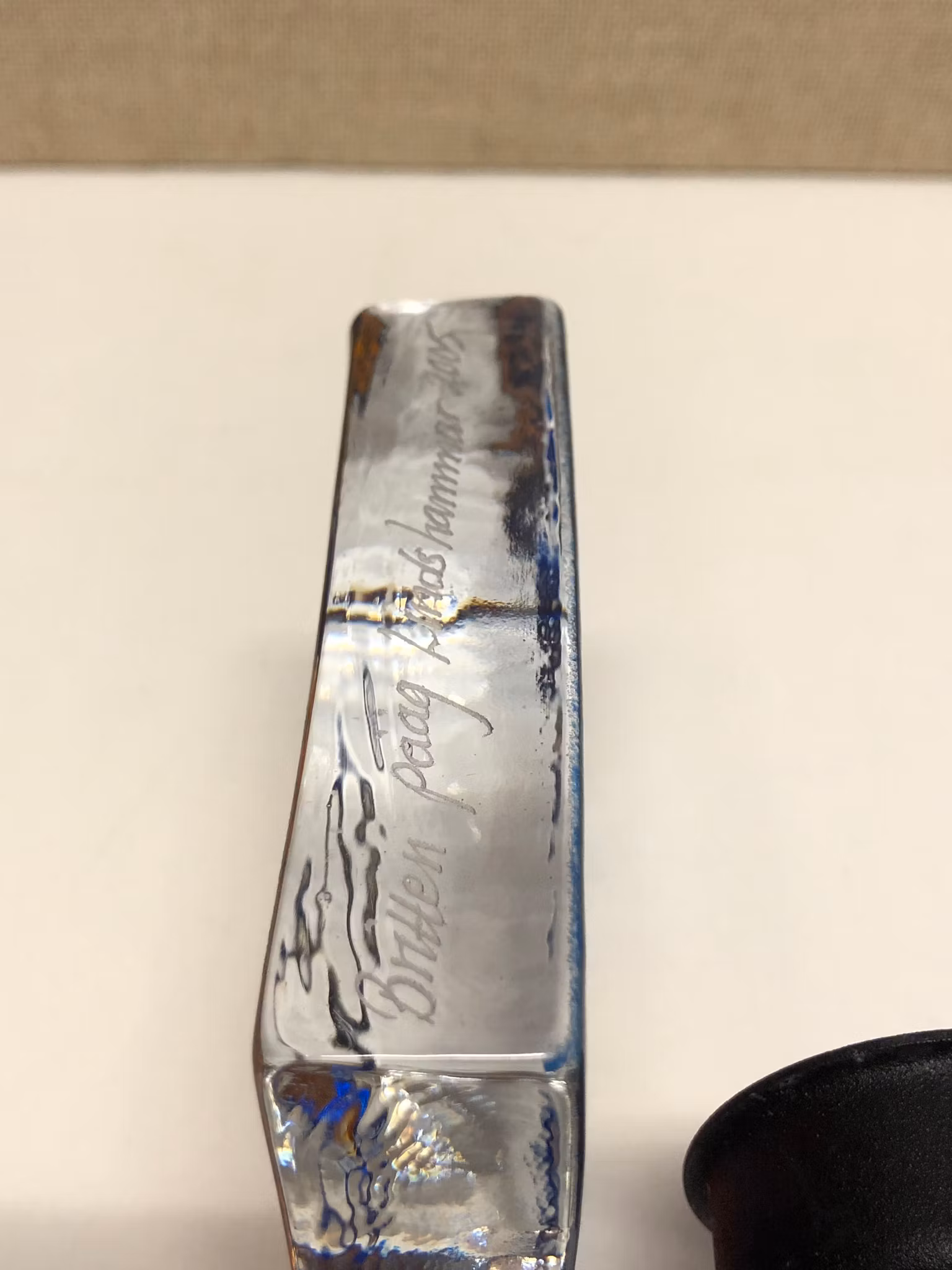 Ljuslykta i glas med stomme i metall signerad Britten Pååg Lindshammar 2005.