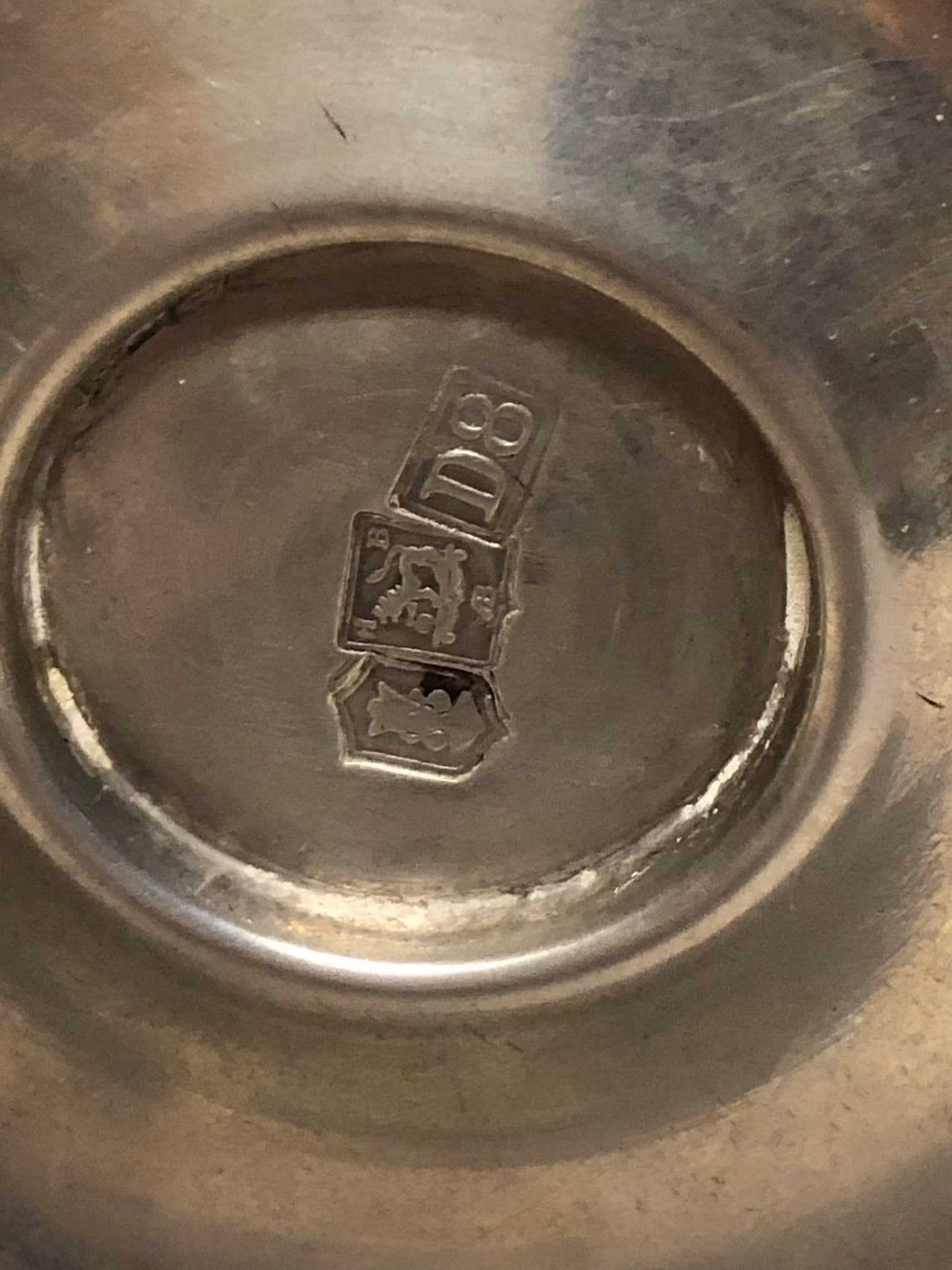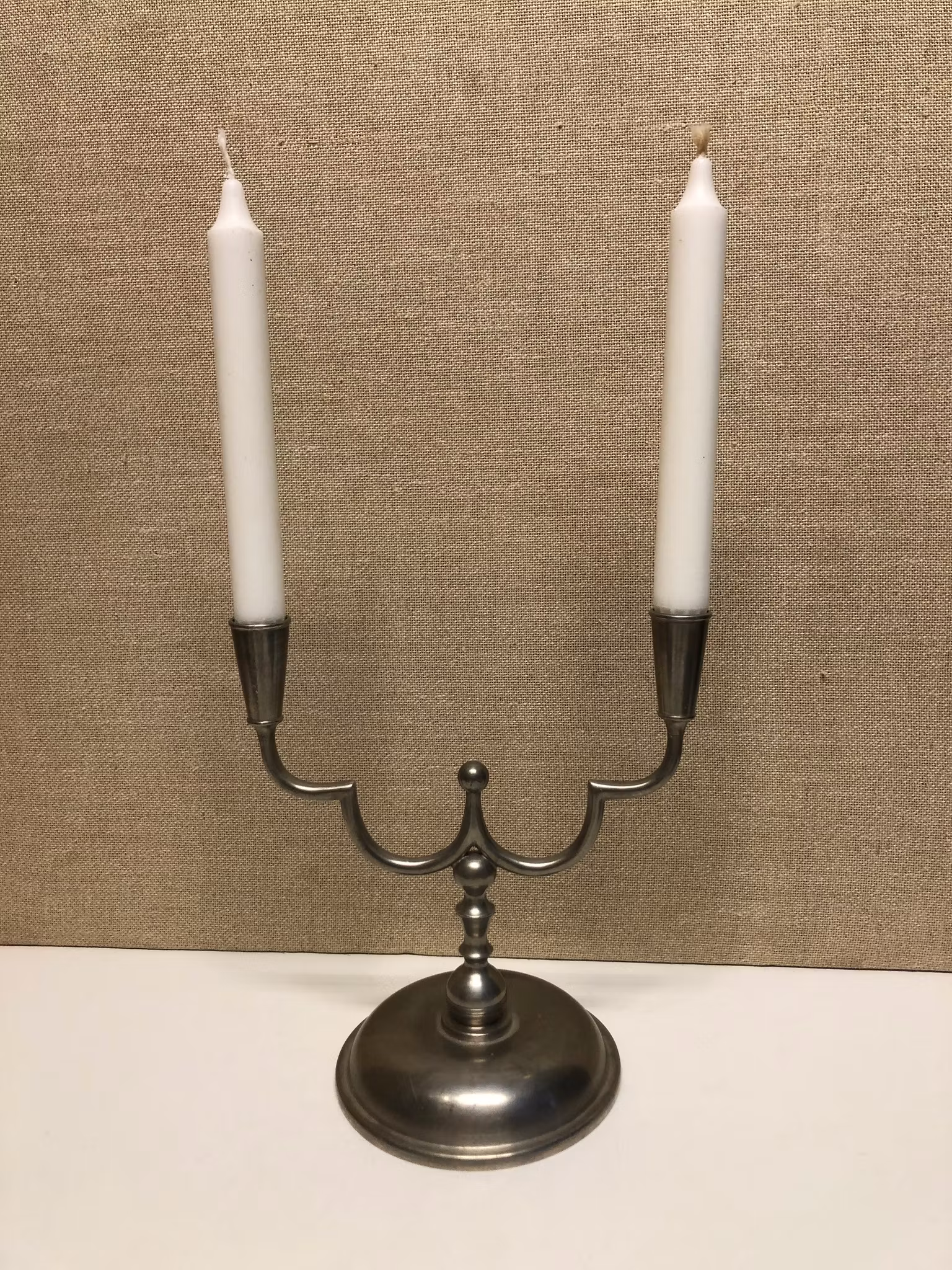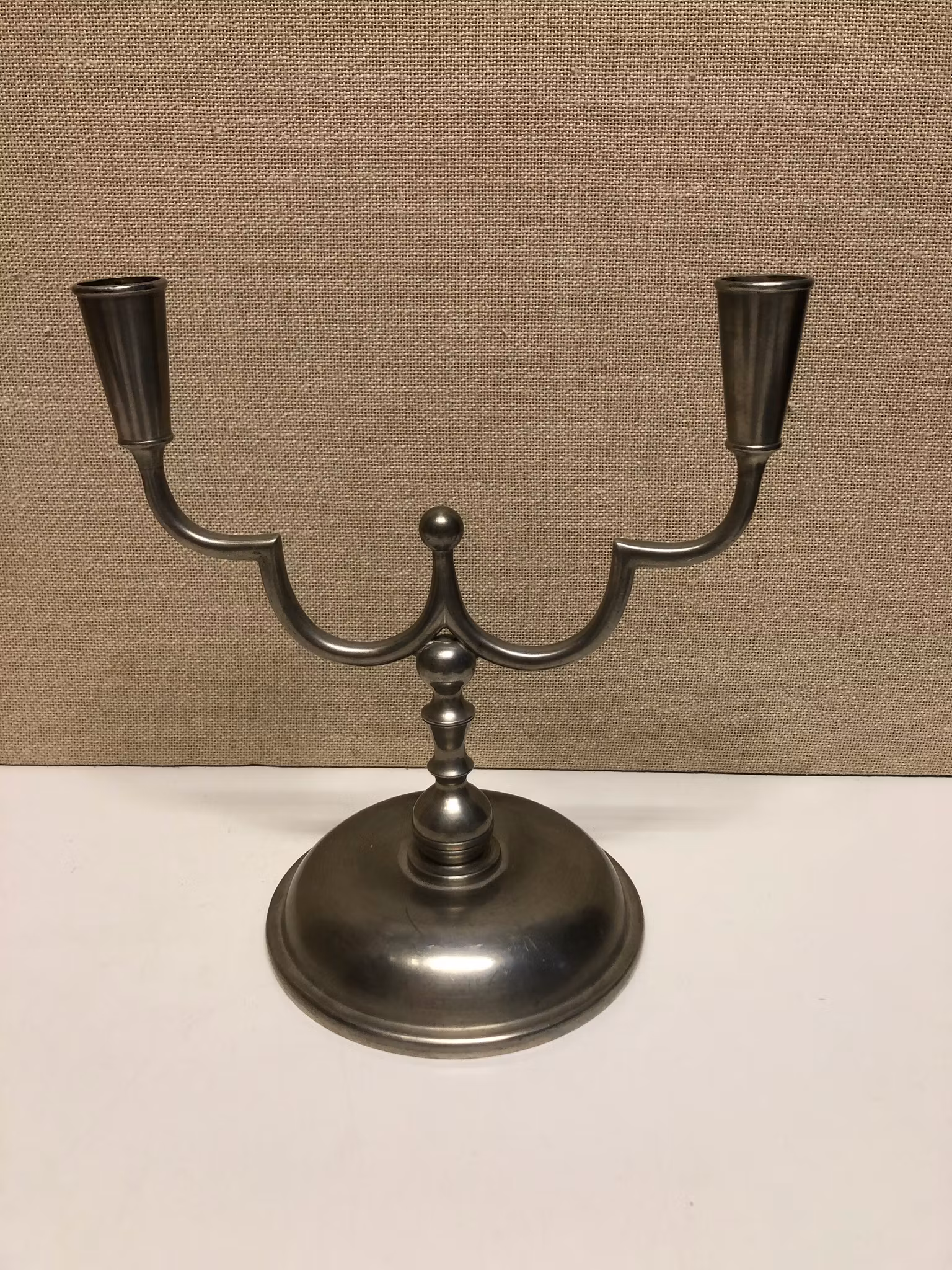 Tvåarmad ljusstake i tenn stämplad Stockholms stadsstämpel H B AB Herman Bergman Konstgjuteri samt D8=1930.