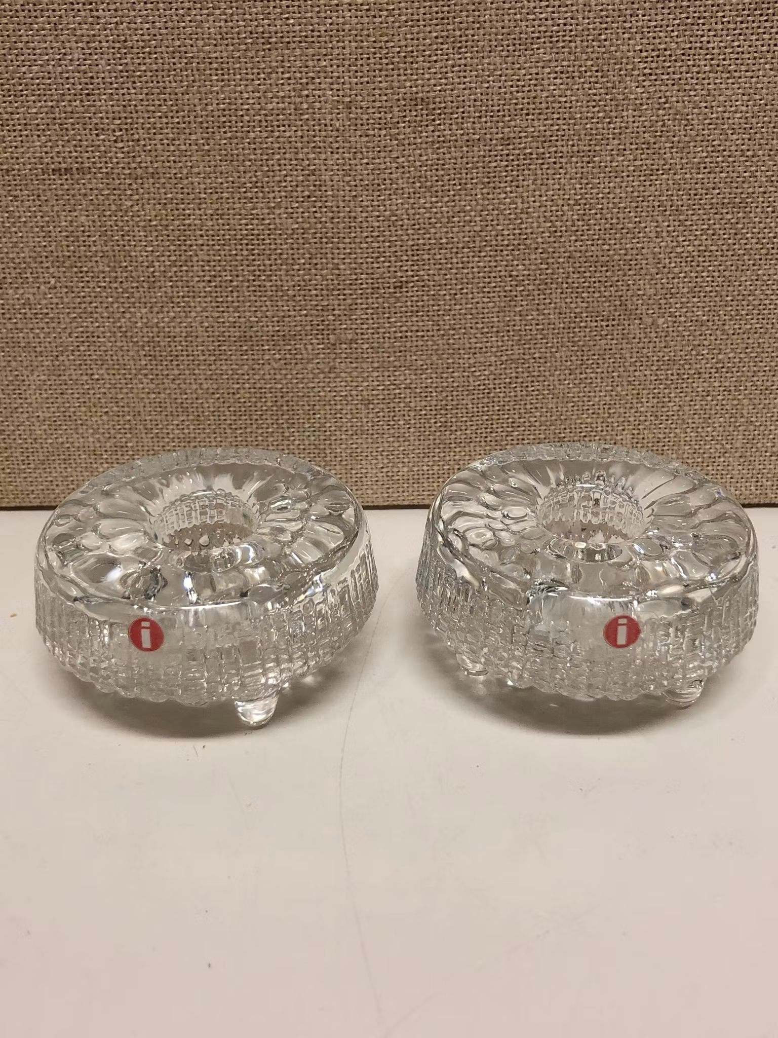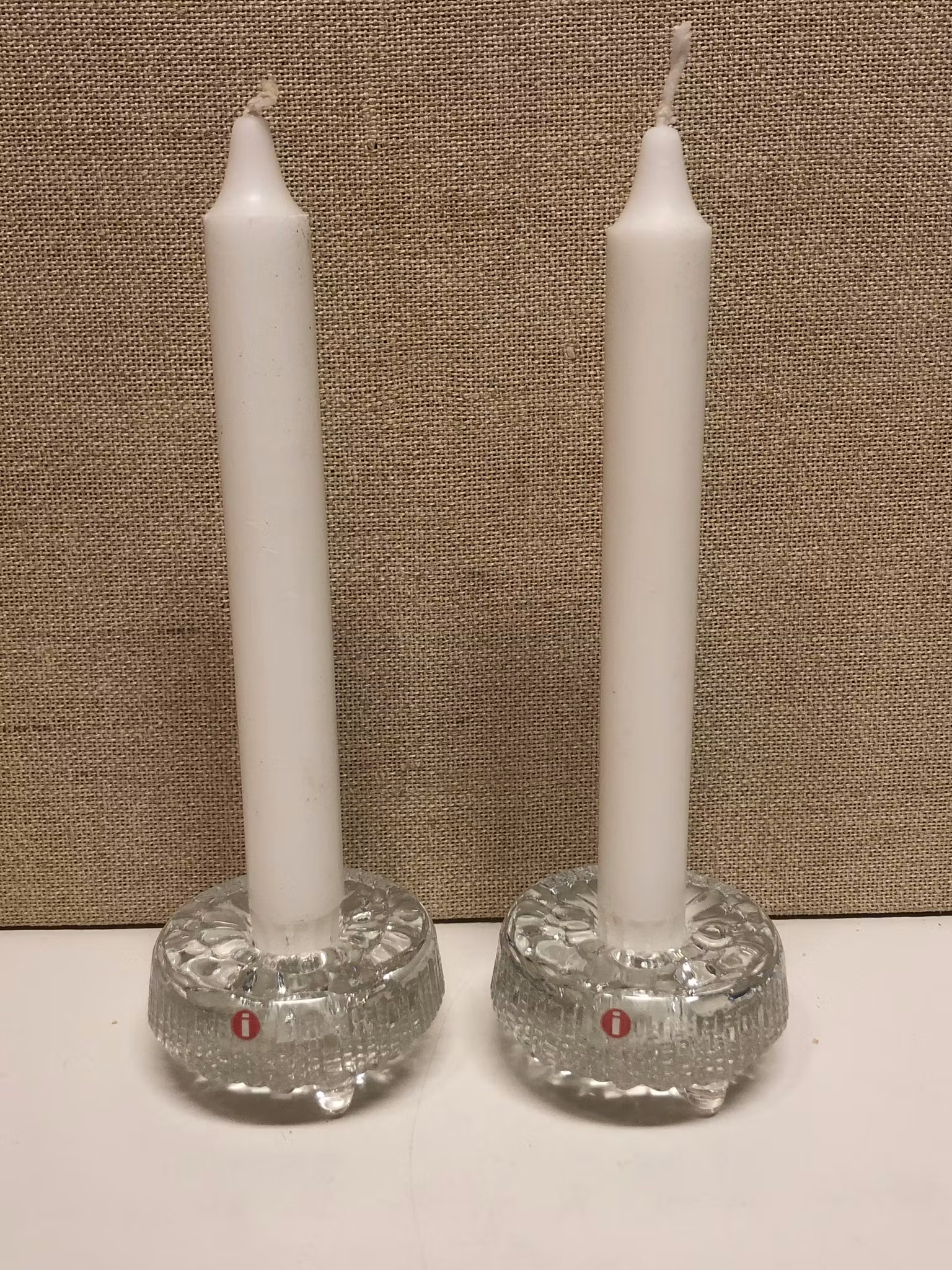 Ett par ljusstakar i glas Ultima Thule design Tapio Wirkkala Iittala Finland, etikett märkta.
