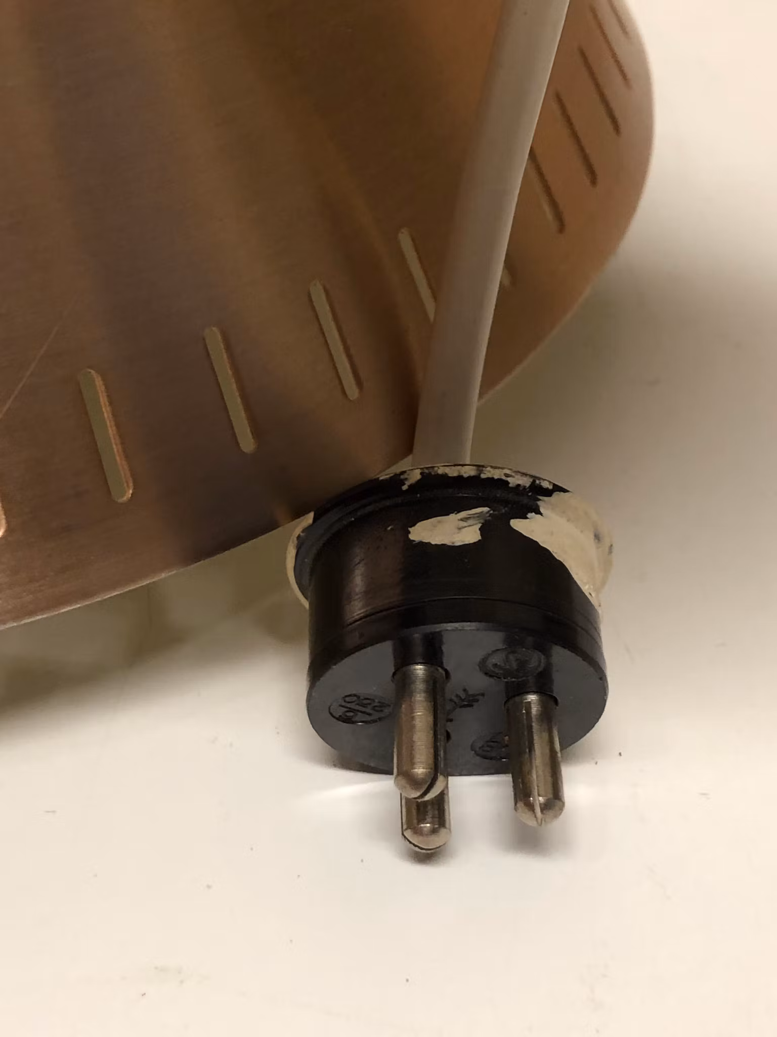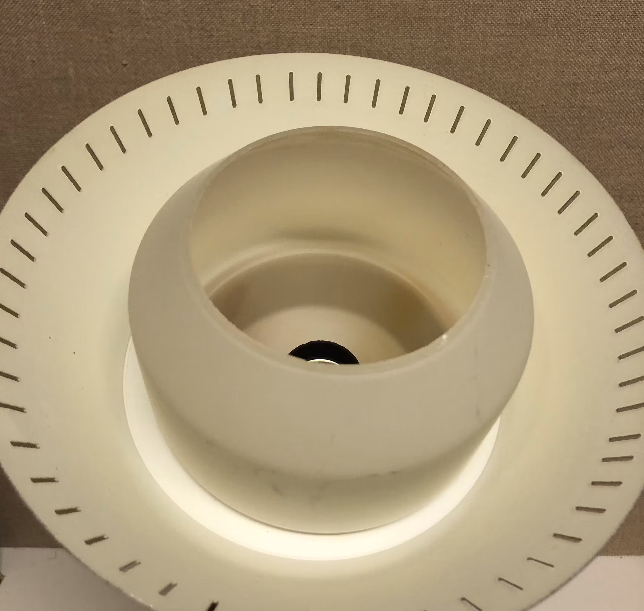 Taklampa kupa i vitt glas, skärm samt fästet i metall.
