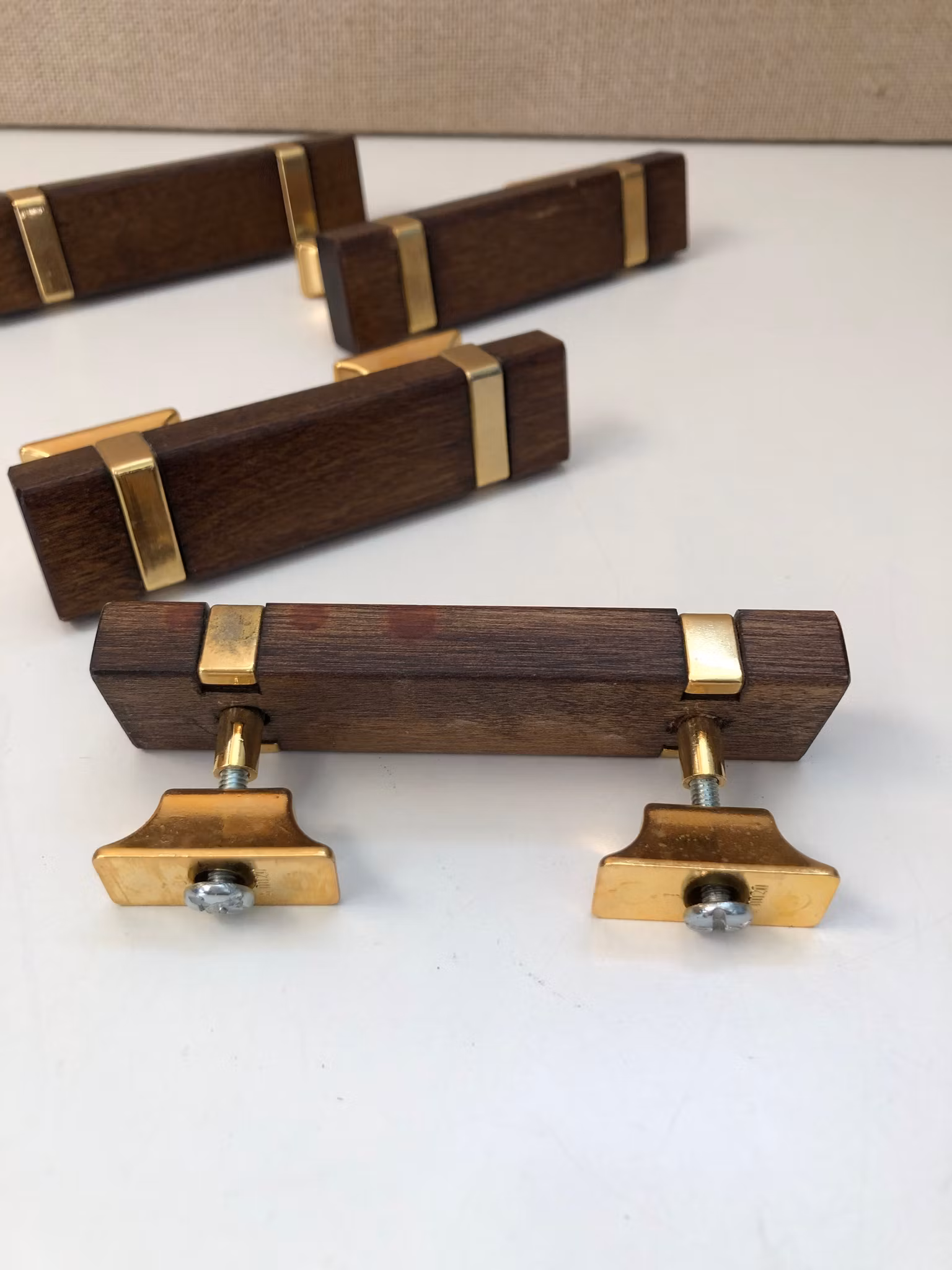 DRAGHANDTAG/ Beslag 4 st. trä/metall, 1970/80-tal.