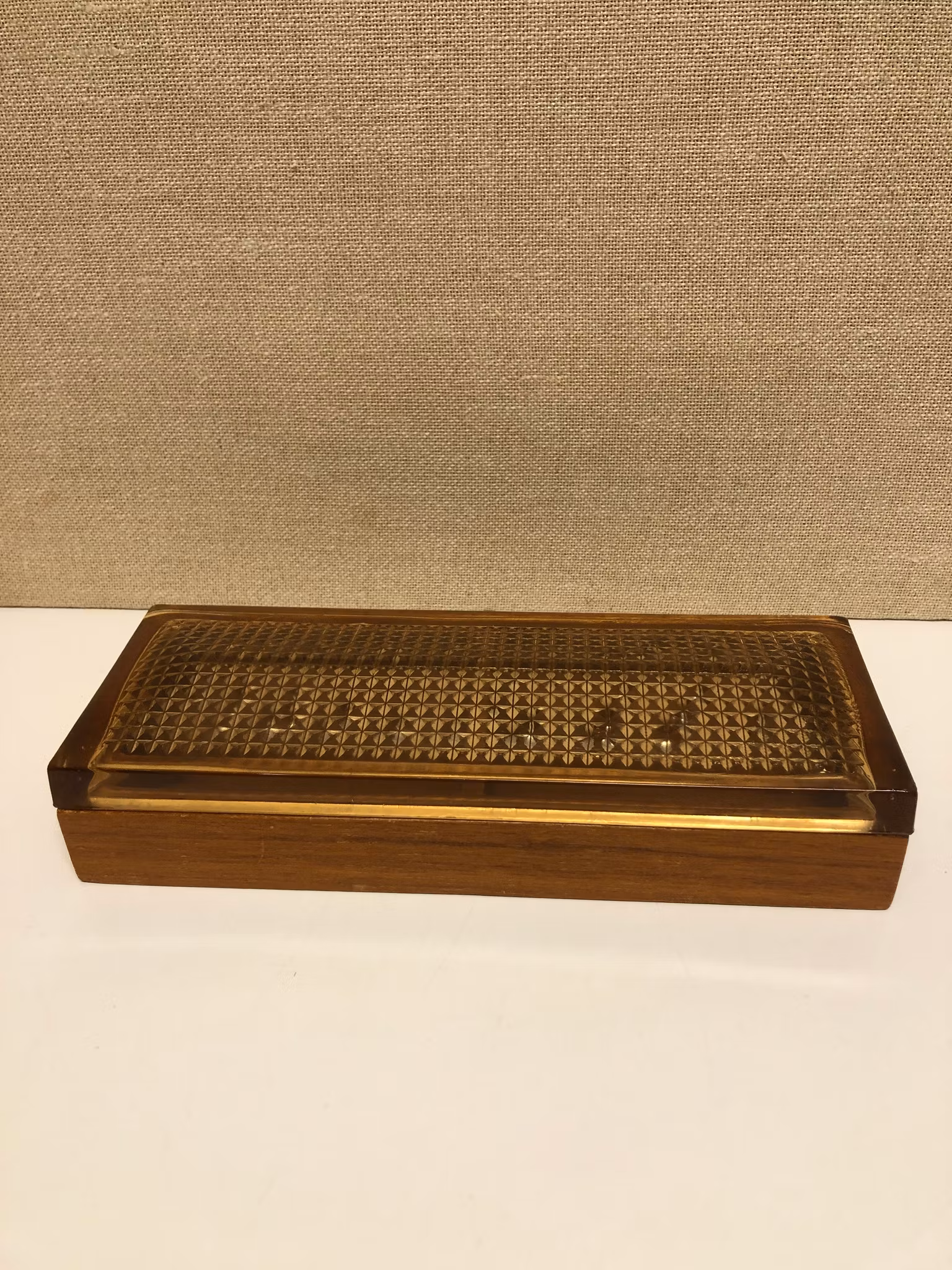 Ask I teak med lock i glas Skruf glasbruk, ej märkt.