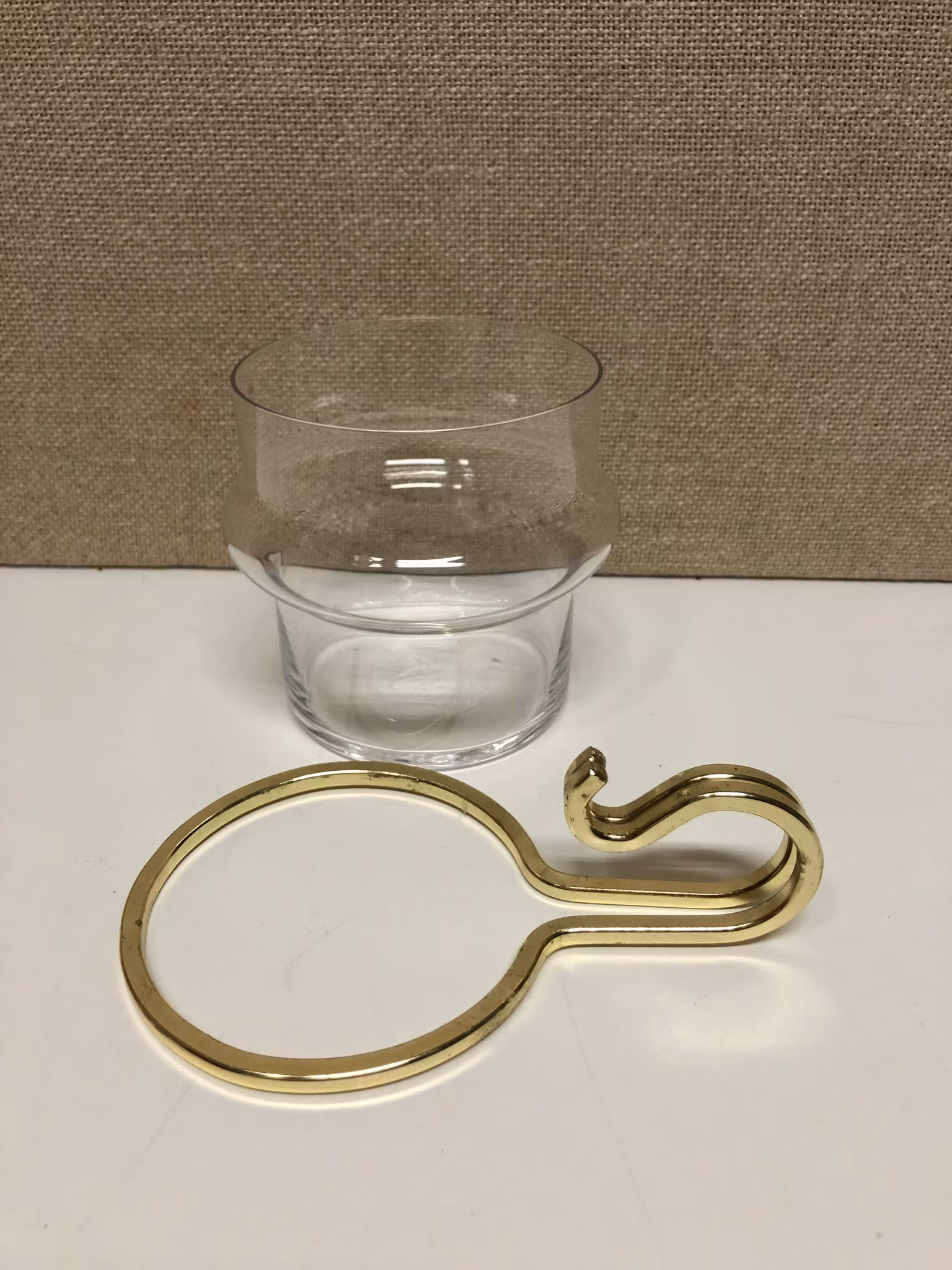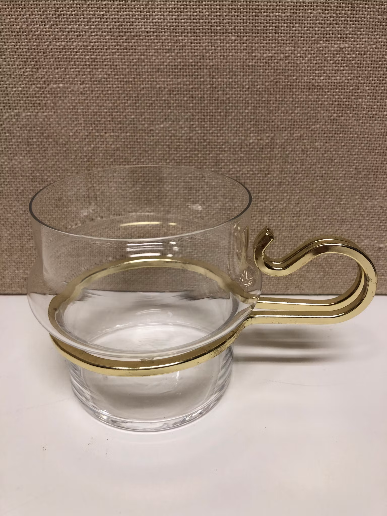 Mugg i glas med avtagbart handtag I gulmetall, design linden & Lindekrantz Orrefors.