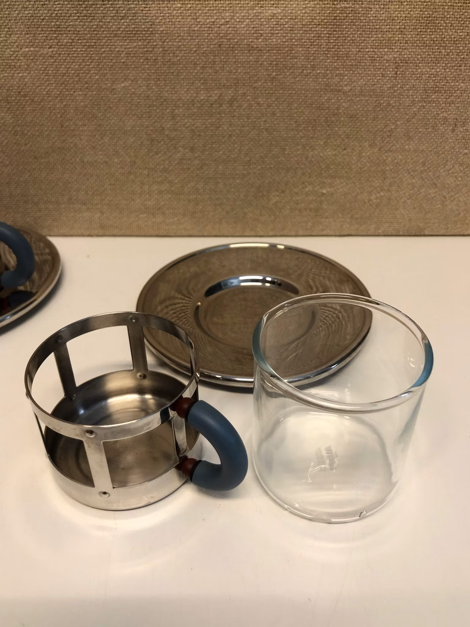 MICHEL GRAVES. Espressokoppar med fat 6 st.glas/metall, Alessi, Italy. 1989