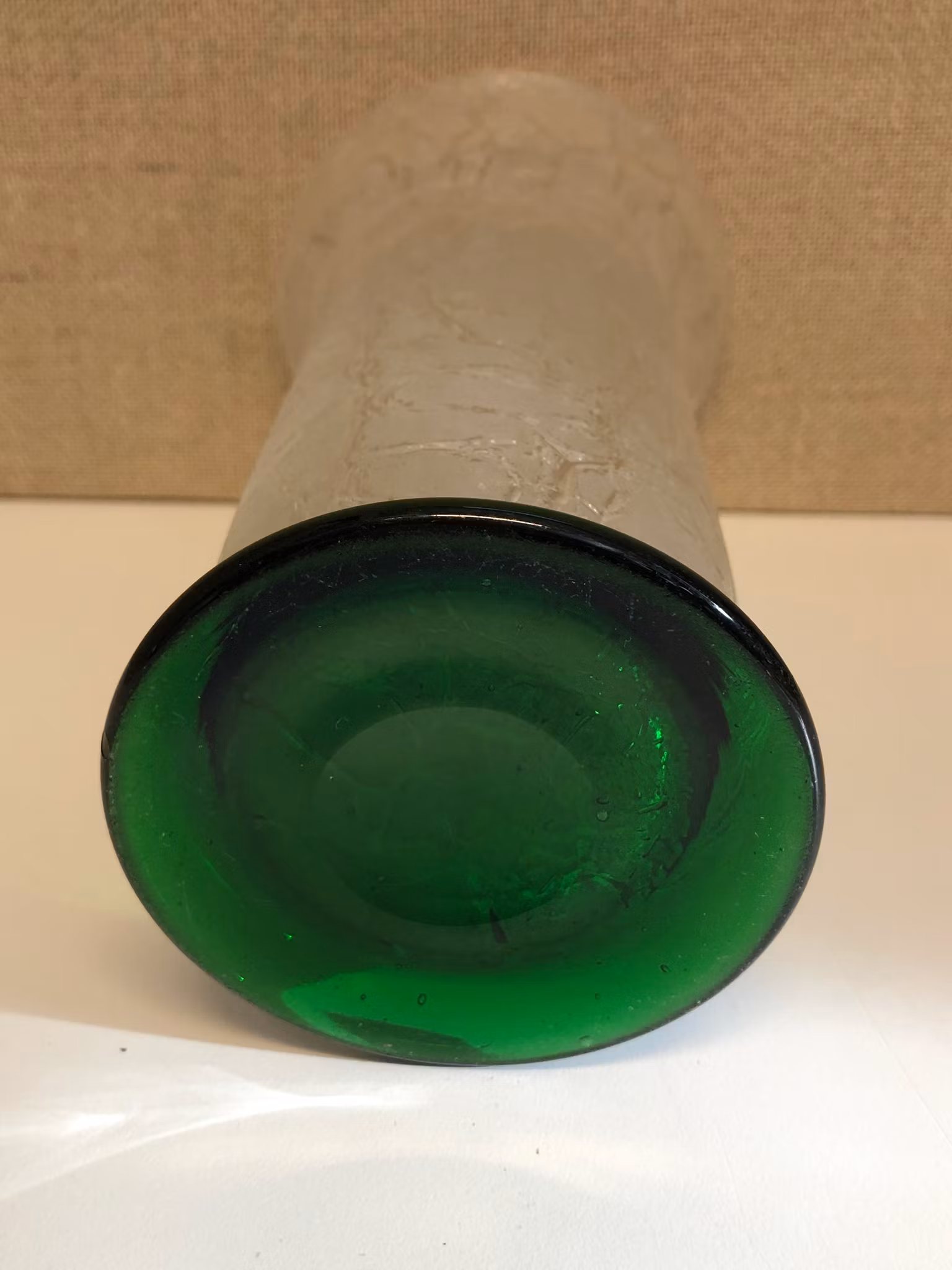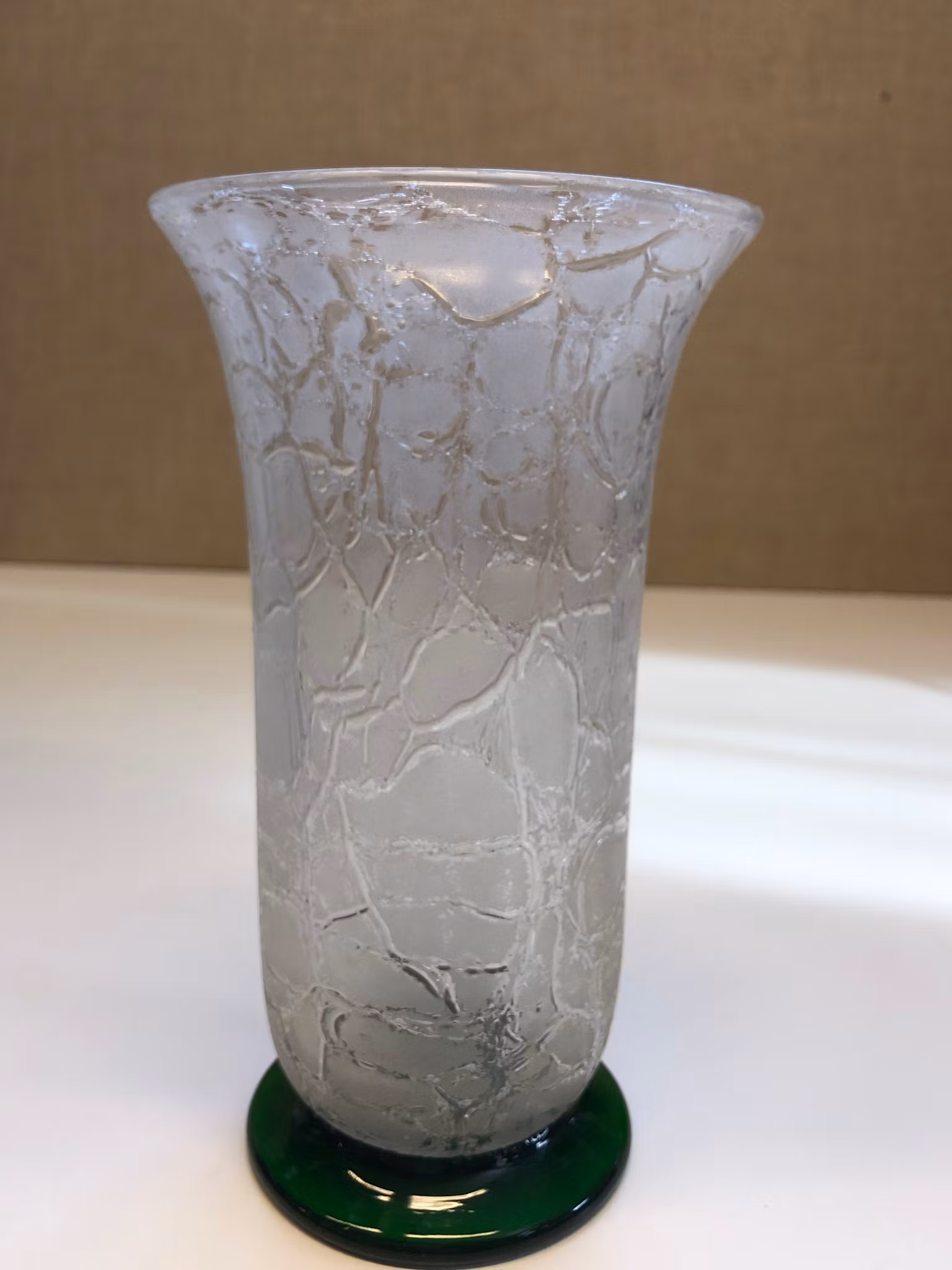 Dekor i relief/frostat, klar glasmassa, avslut med fot i grön glasmassa, handblåst, bortslipat puntelmärke.