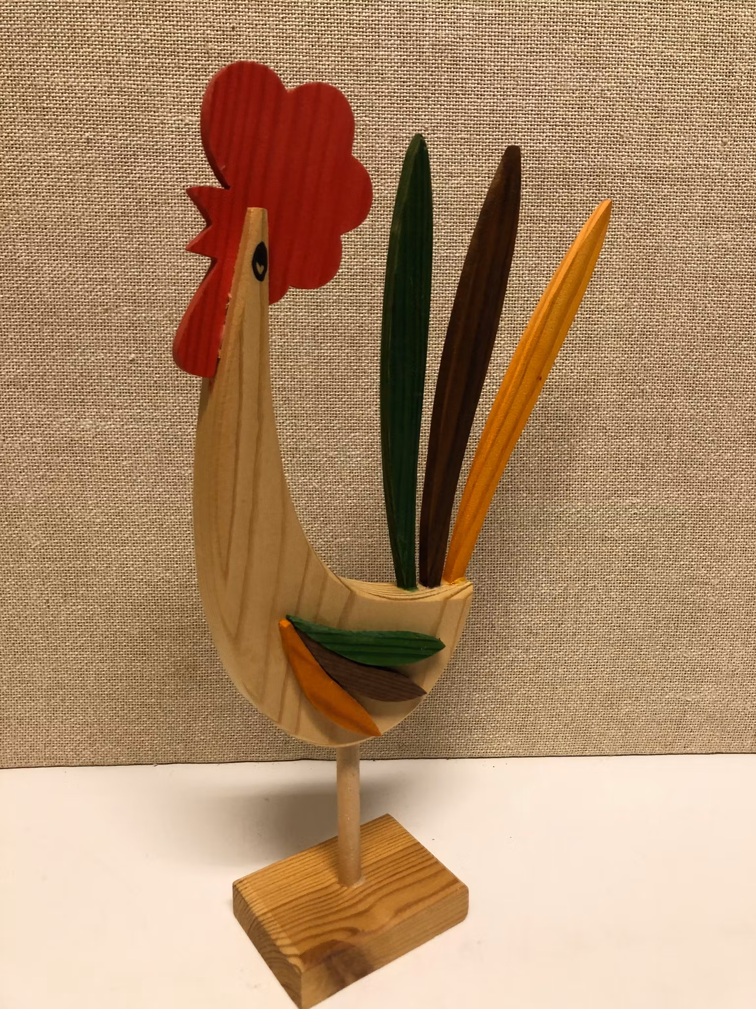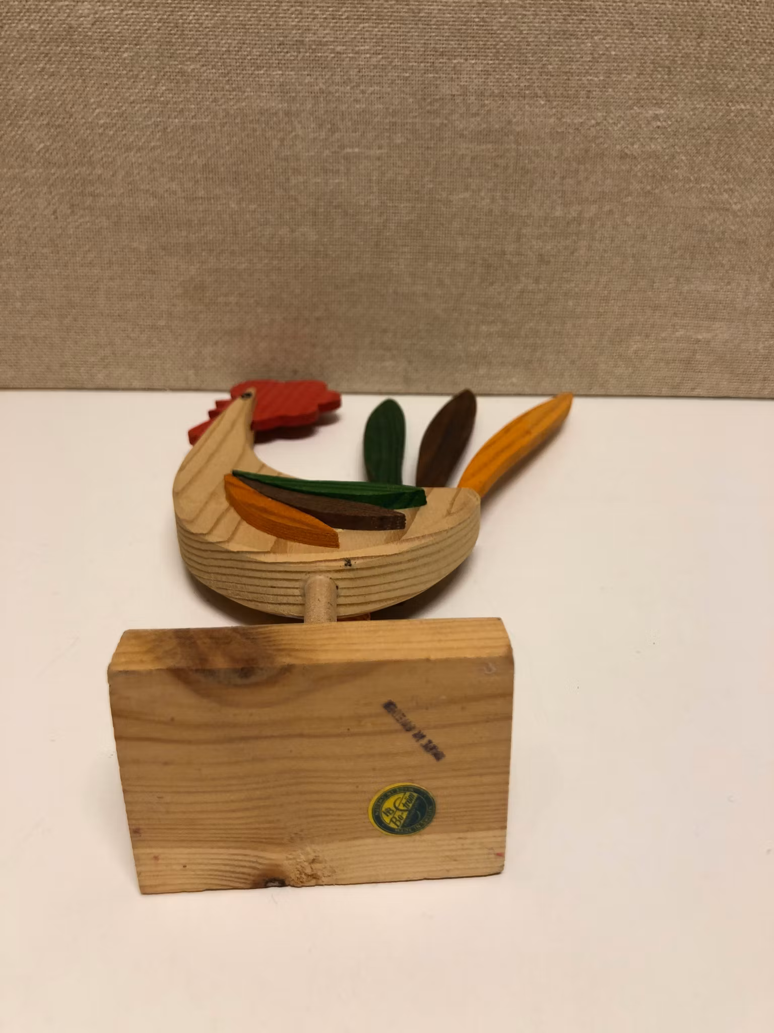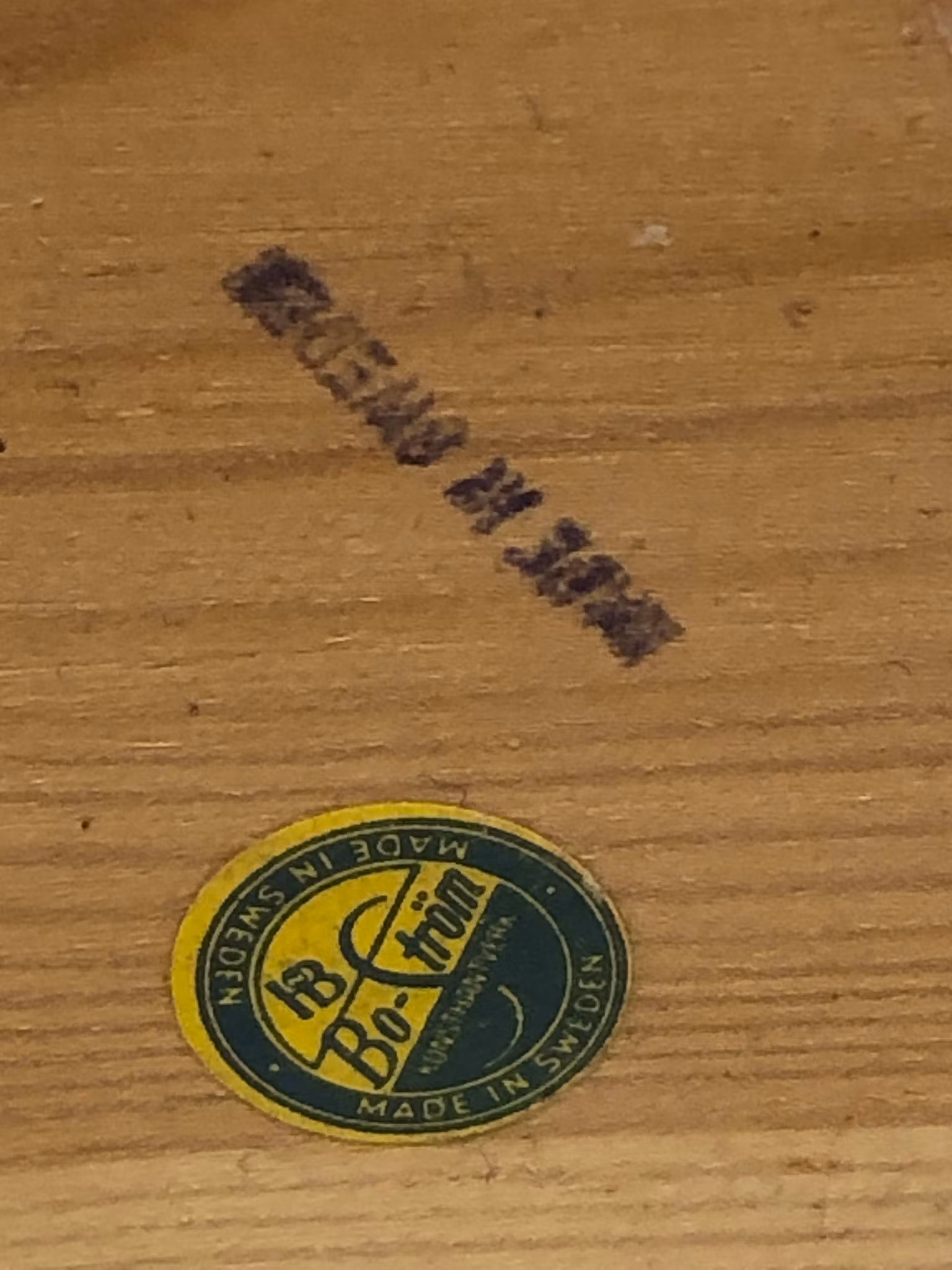 Tupp i furu etikett märkt Bo Ström konsthantverk made in Sweden.