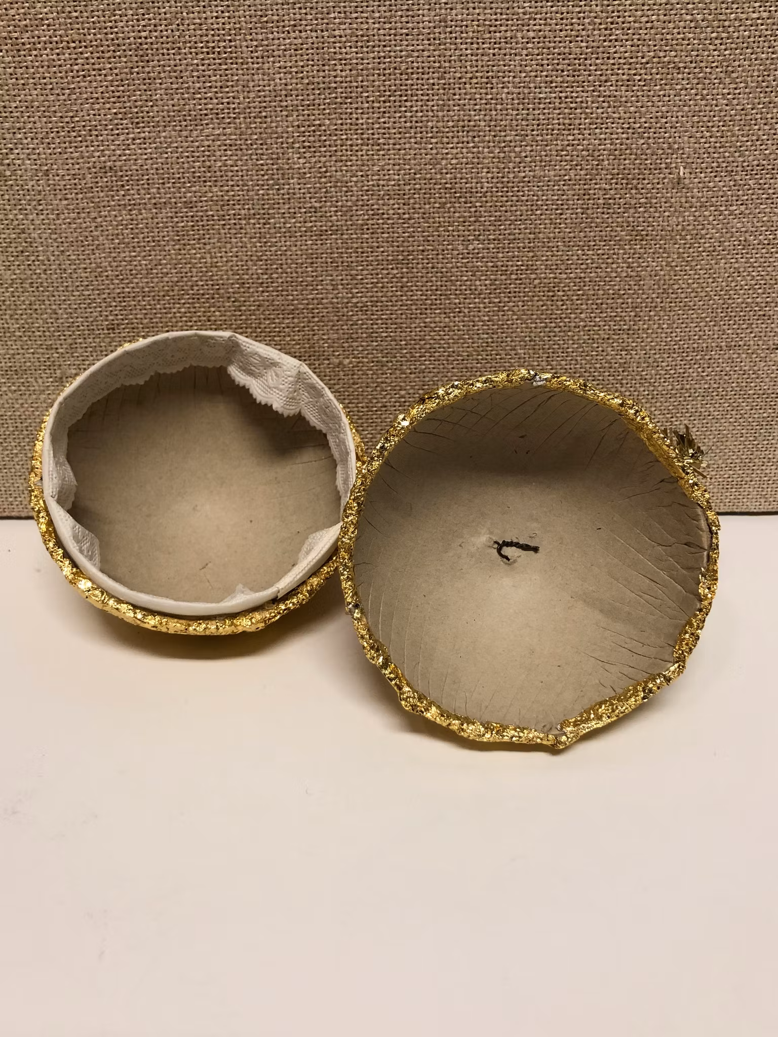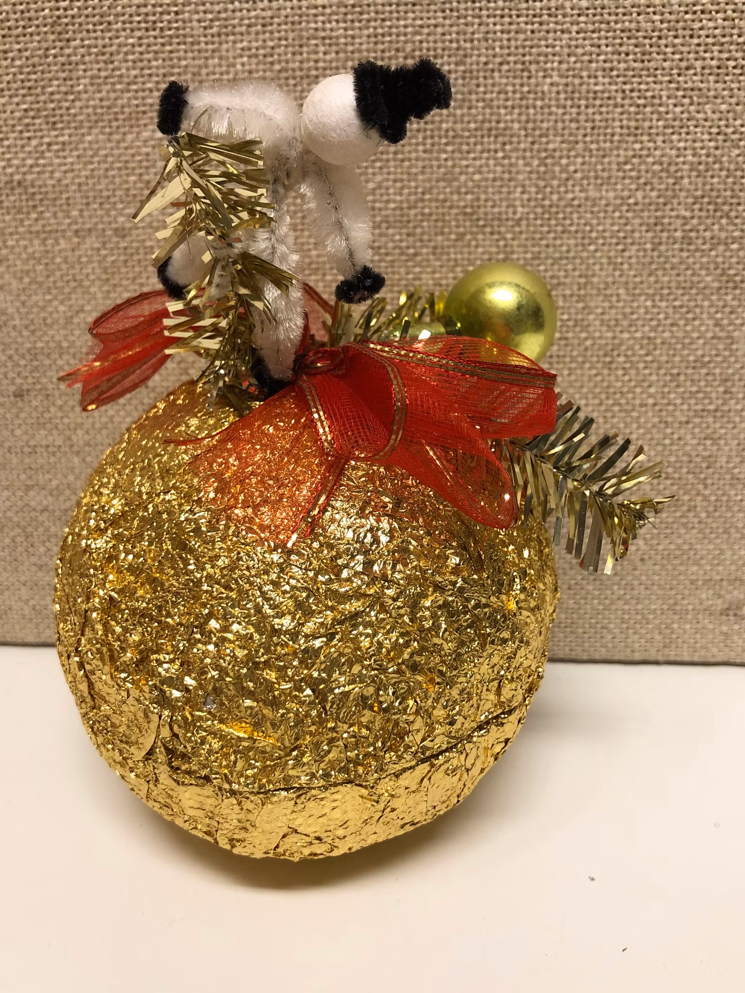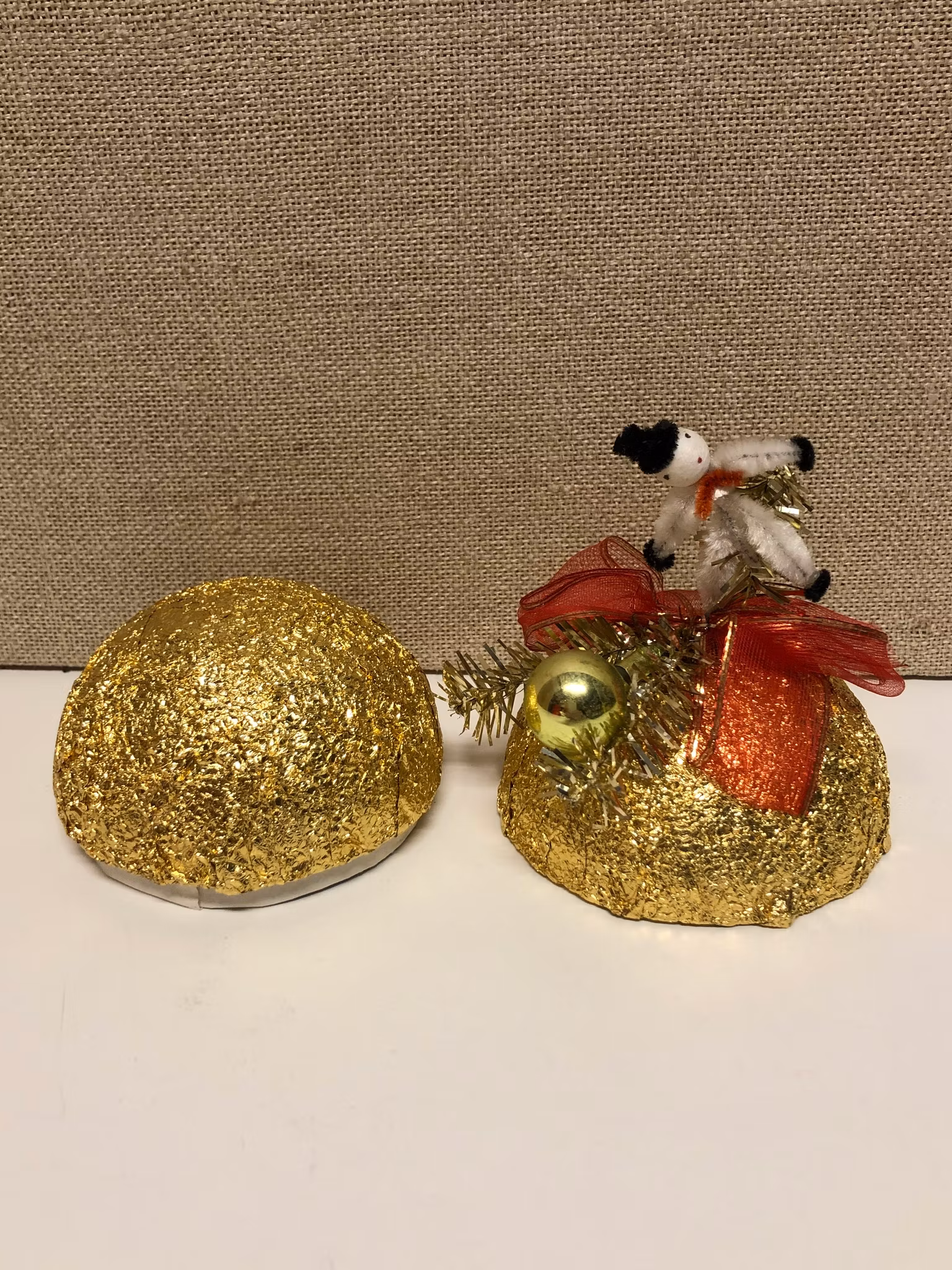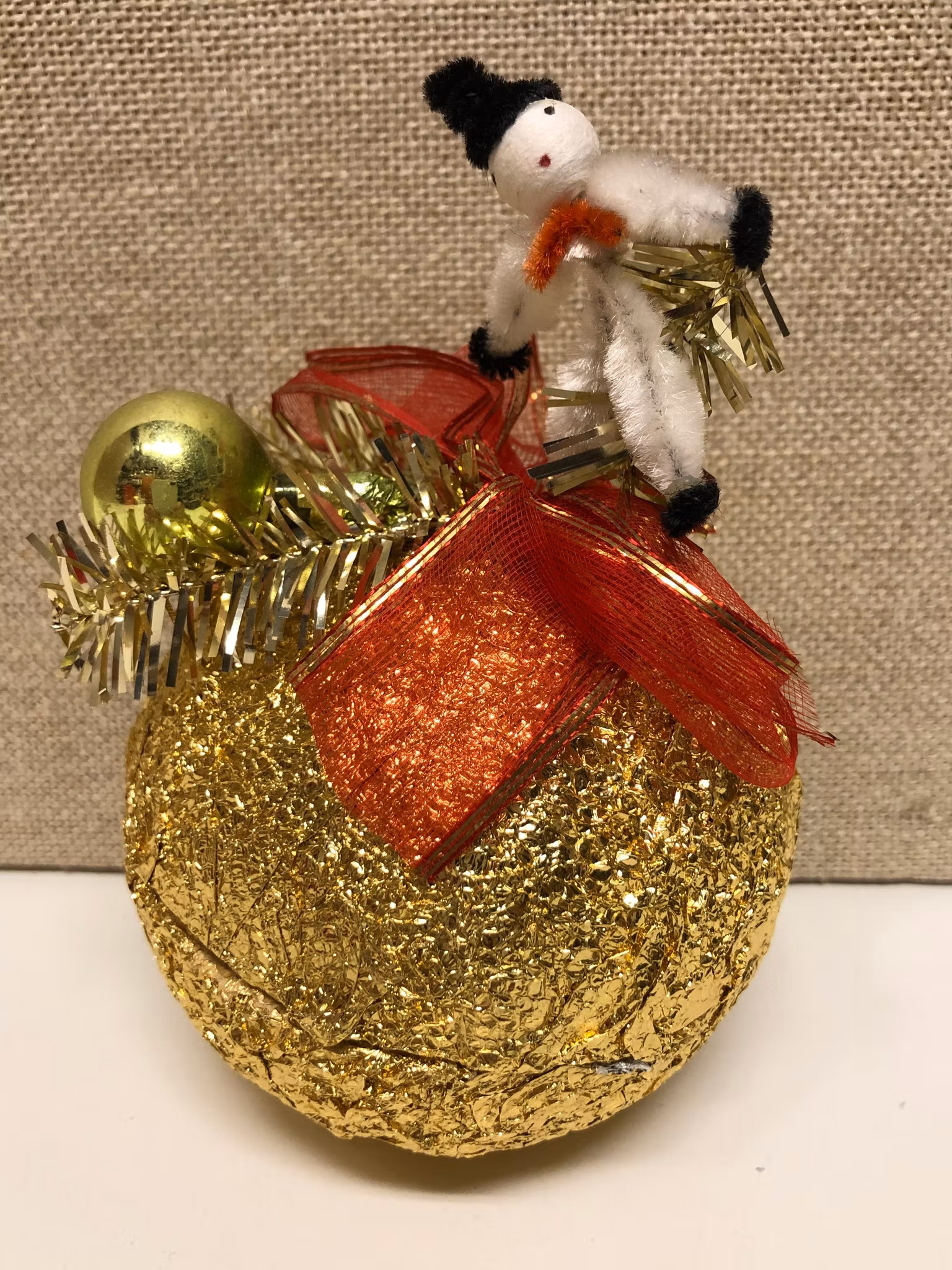 Julägg i papp klädd med guldfärgad folie, dekorerad med  julkula rostett glitter samt snögubbe av piprensare.
