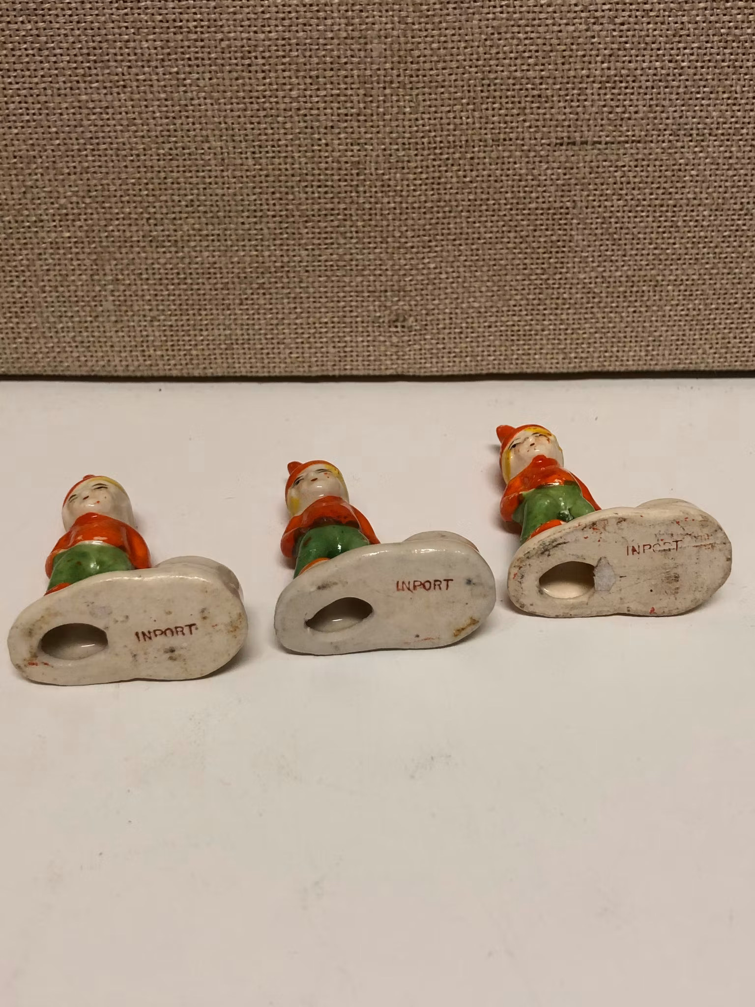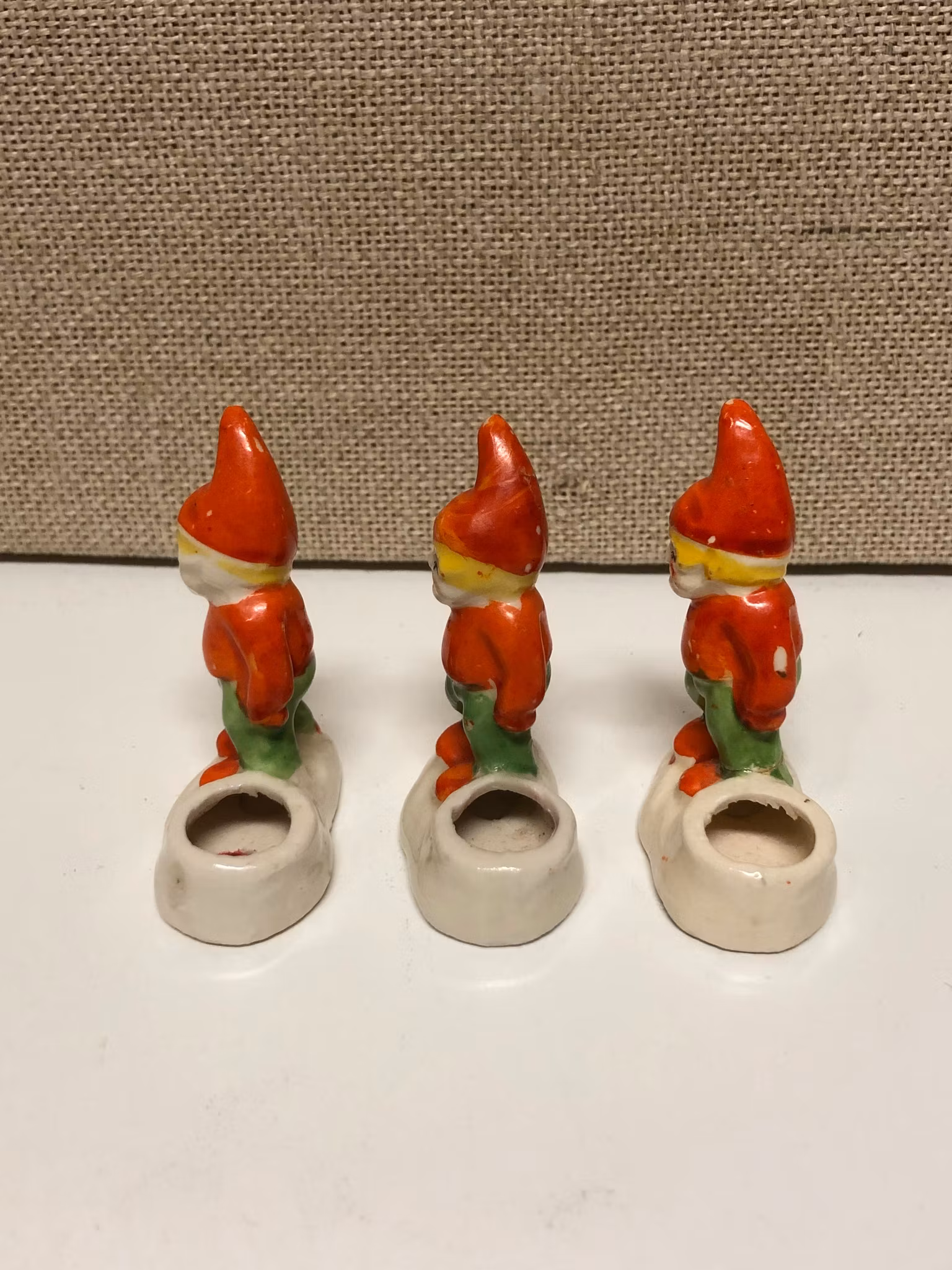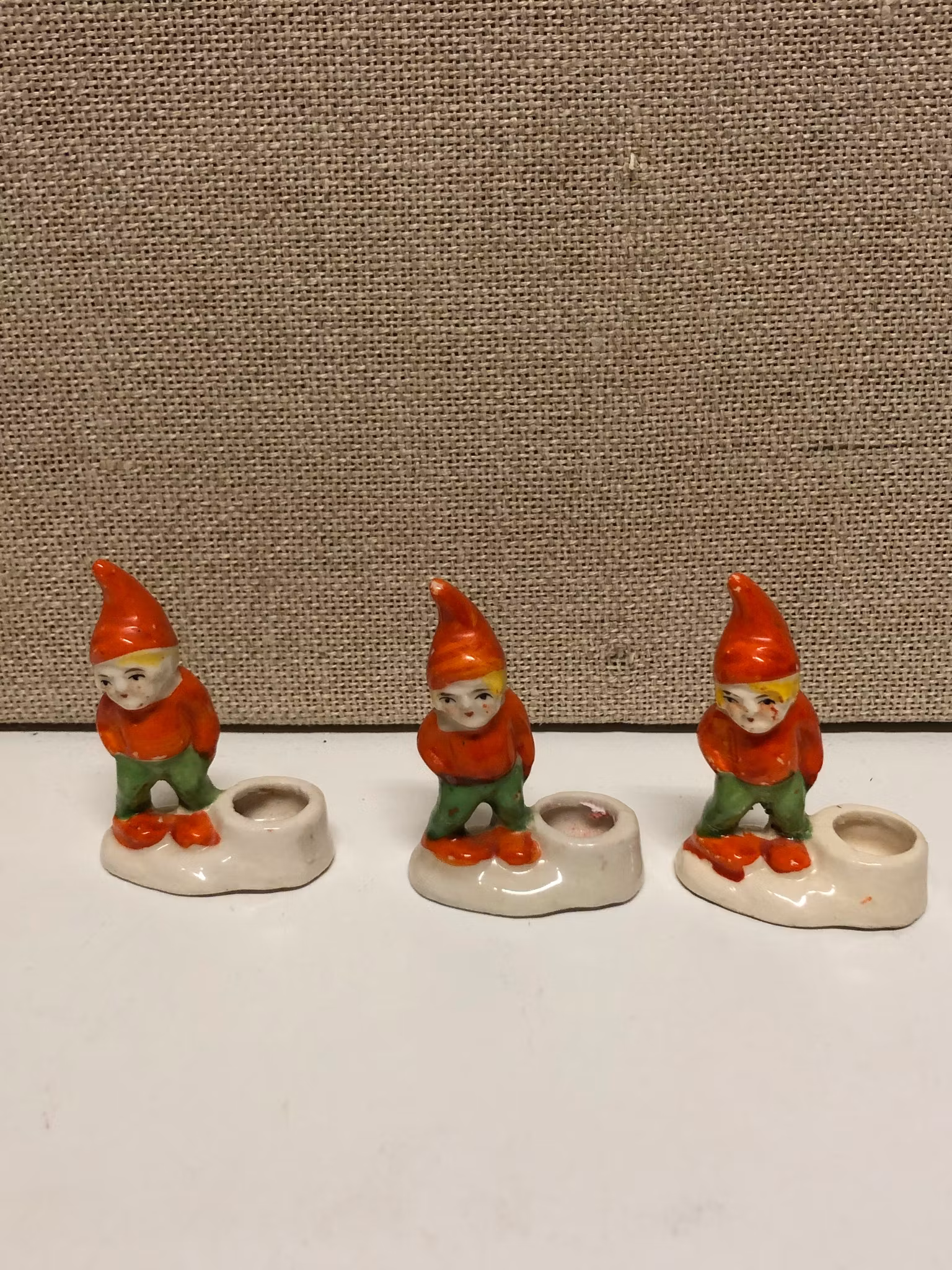Ljusstakar 3 st.  porslin i form av Jultomtar, märkta med röd stämpel IMPORT.
