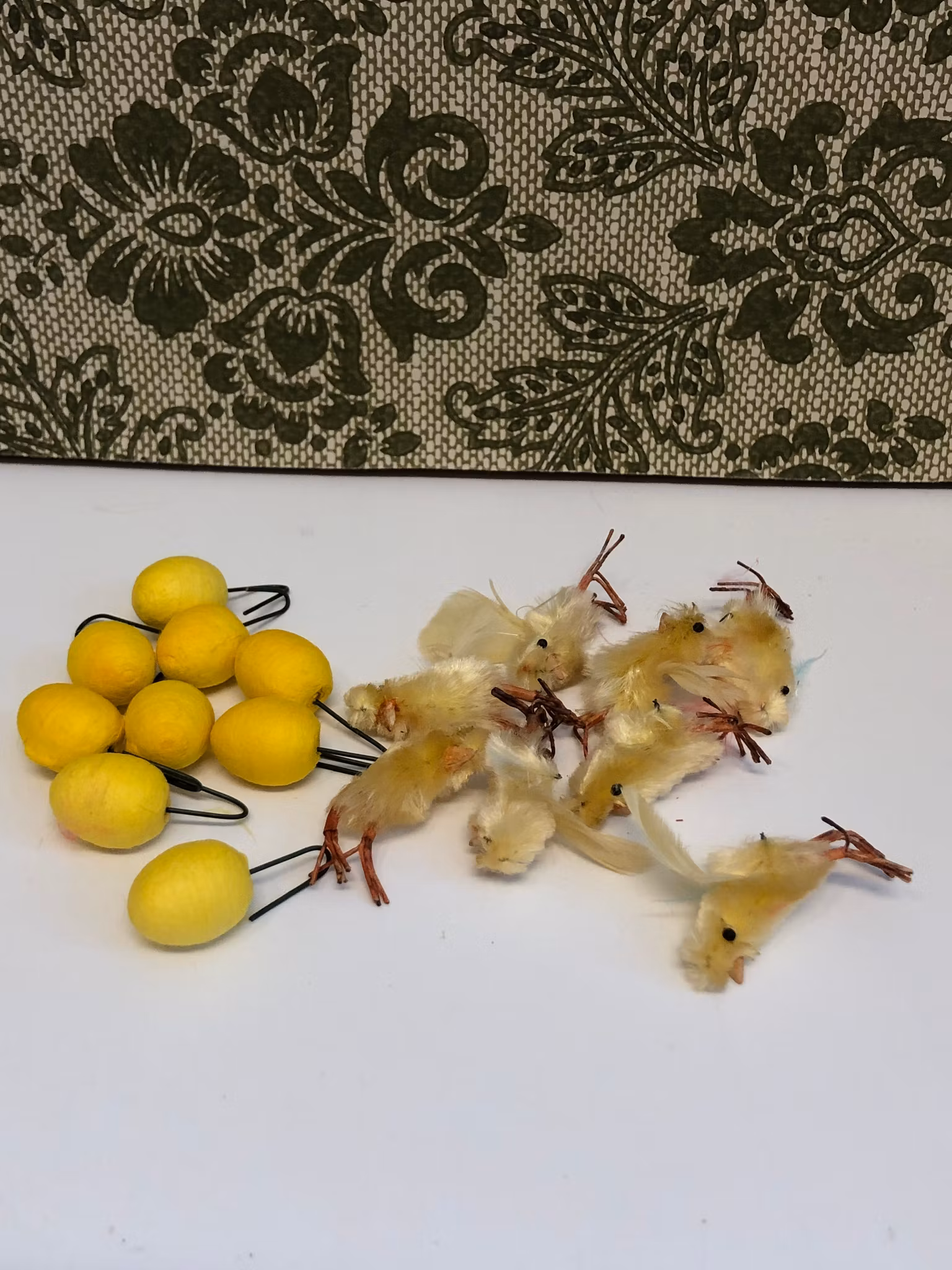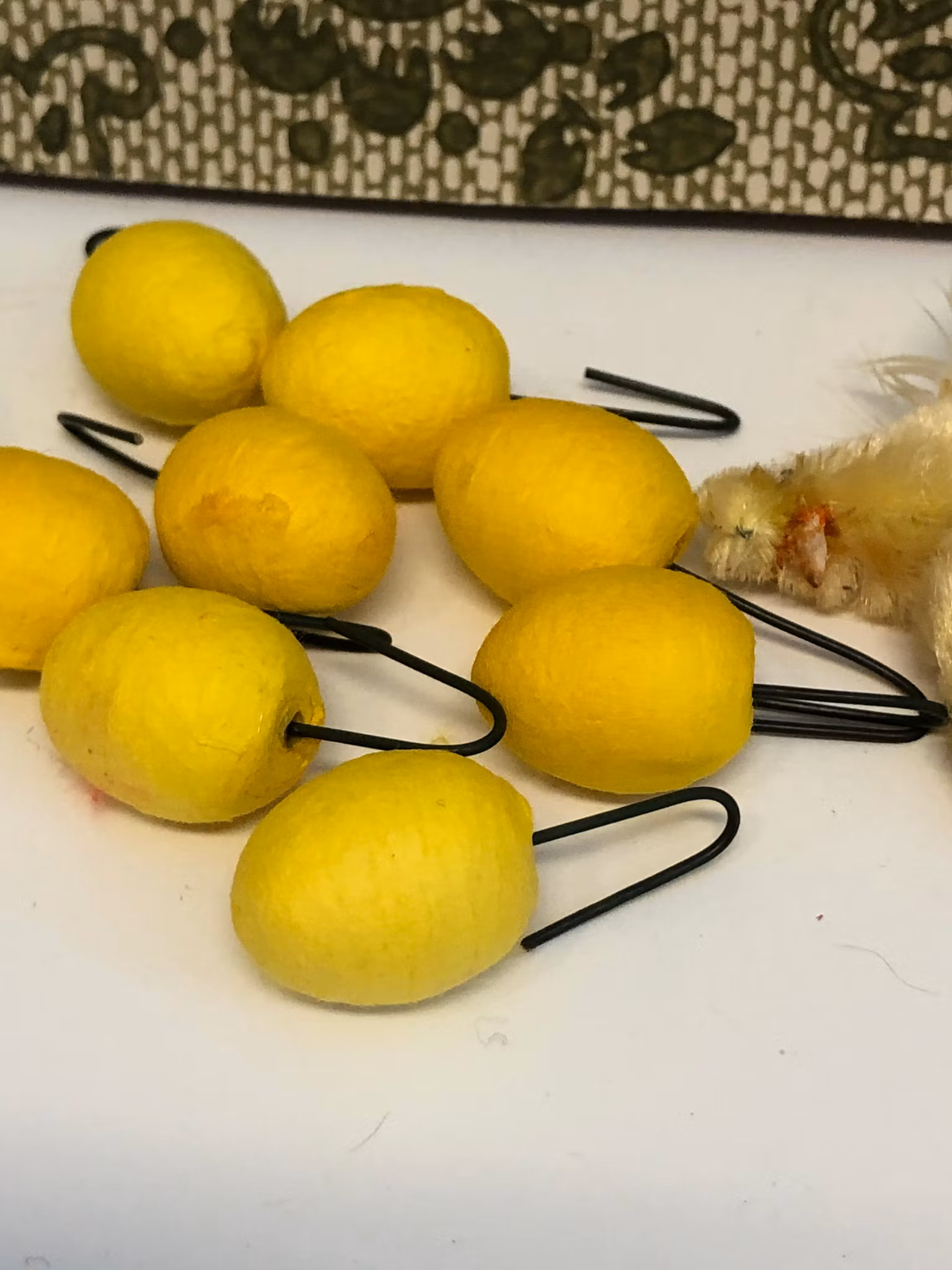 9 st. påskägg i papper för att pynta riset samt 8 st. kycklingar gjorda av piprensare..