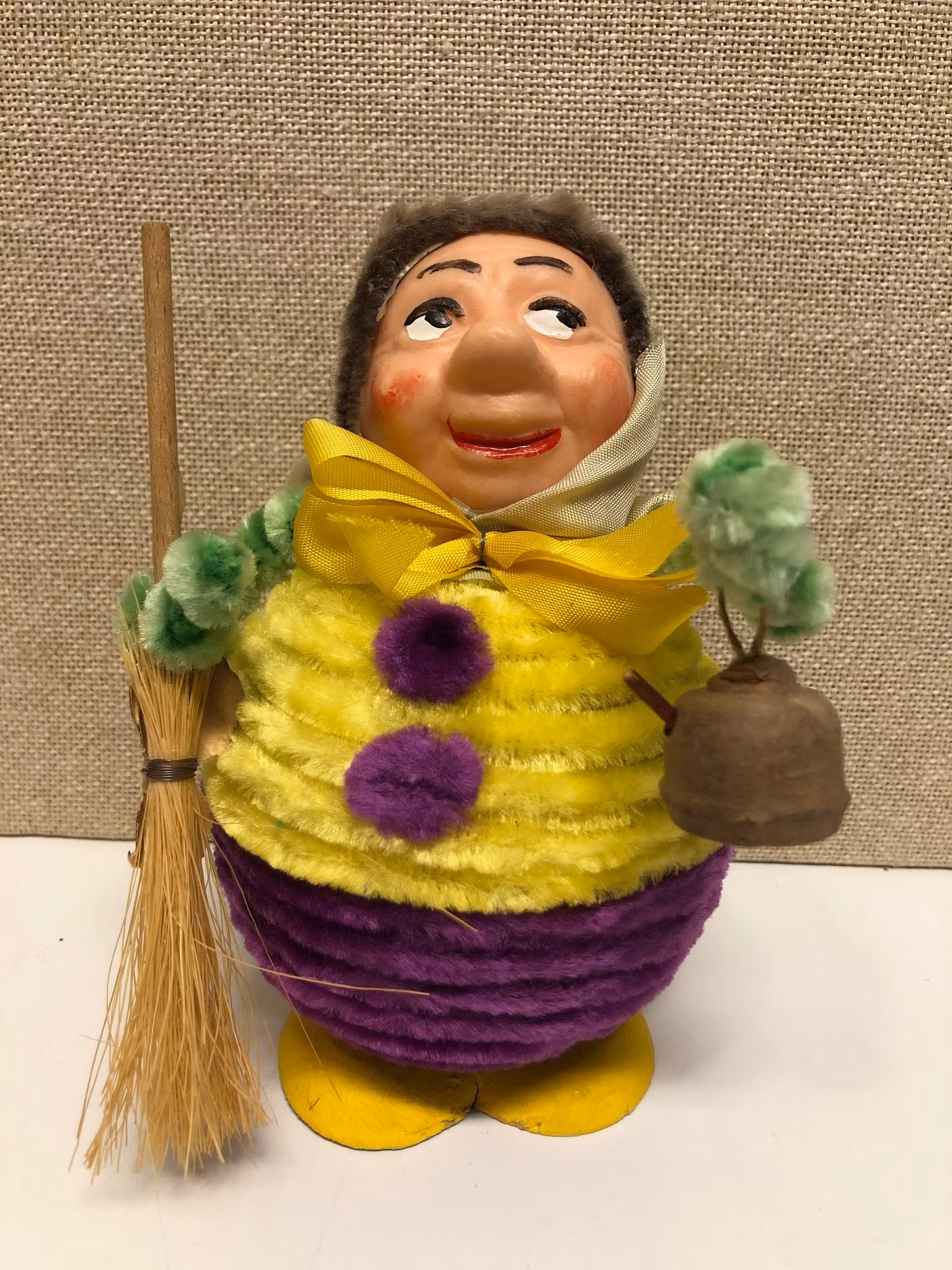 Påskkäring/godisgömma med stomme i pappmaterial samt klädd med piprensare, huvud i plastmaterial samt kvast och kaffepanna i trä.