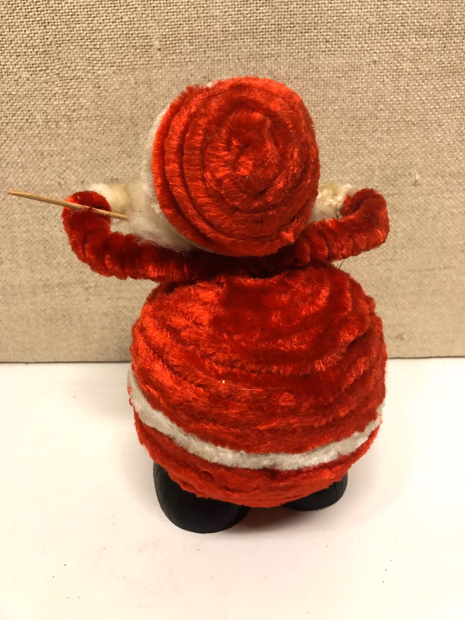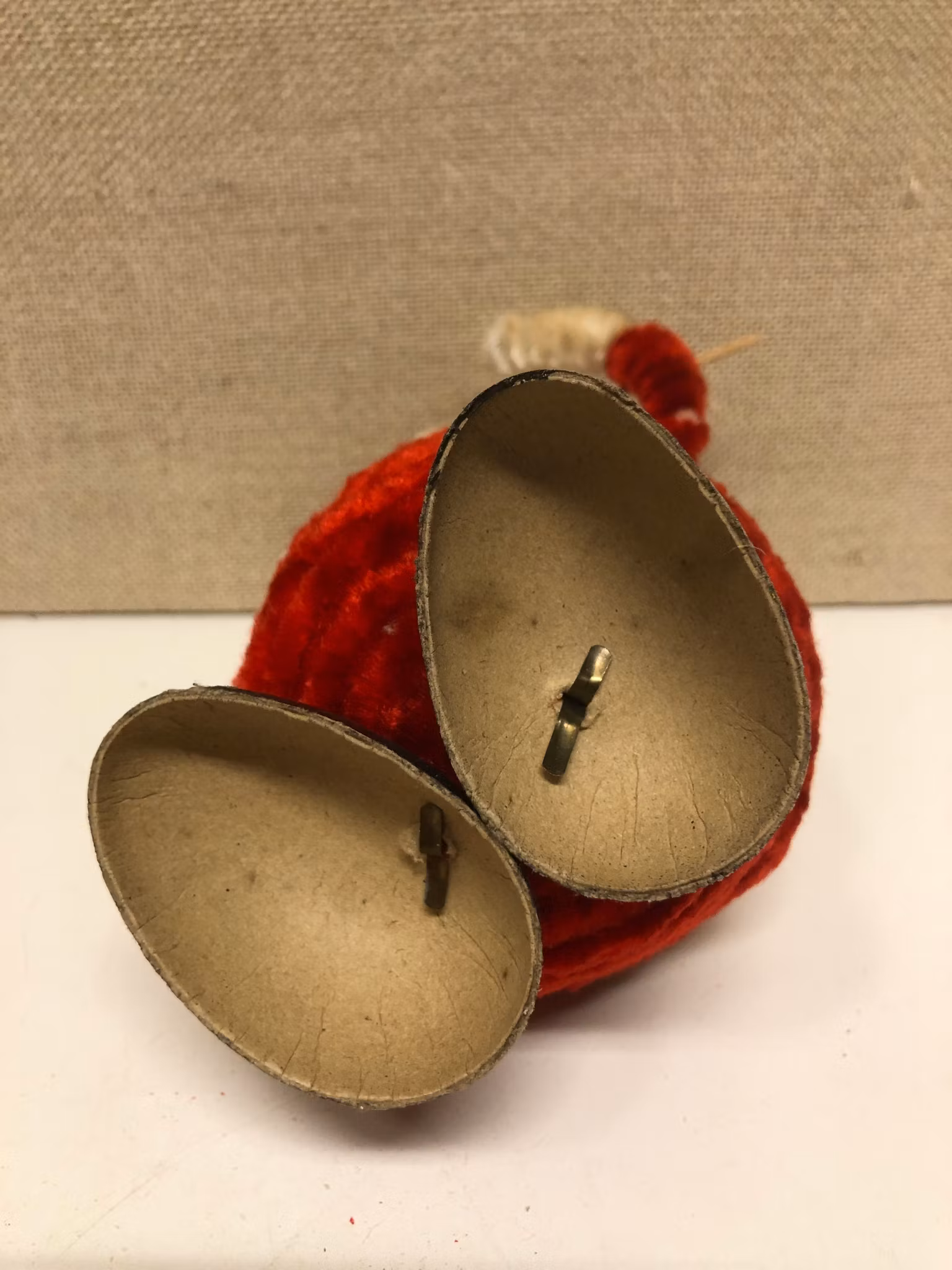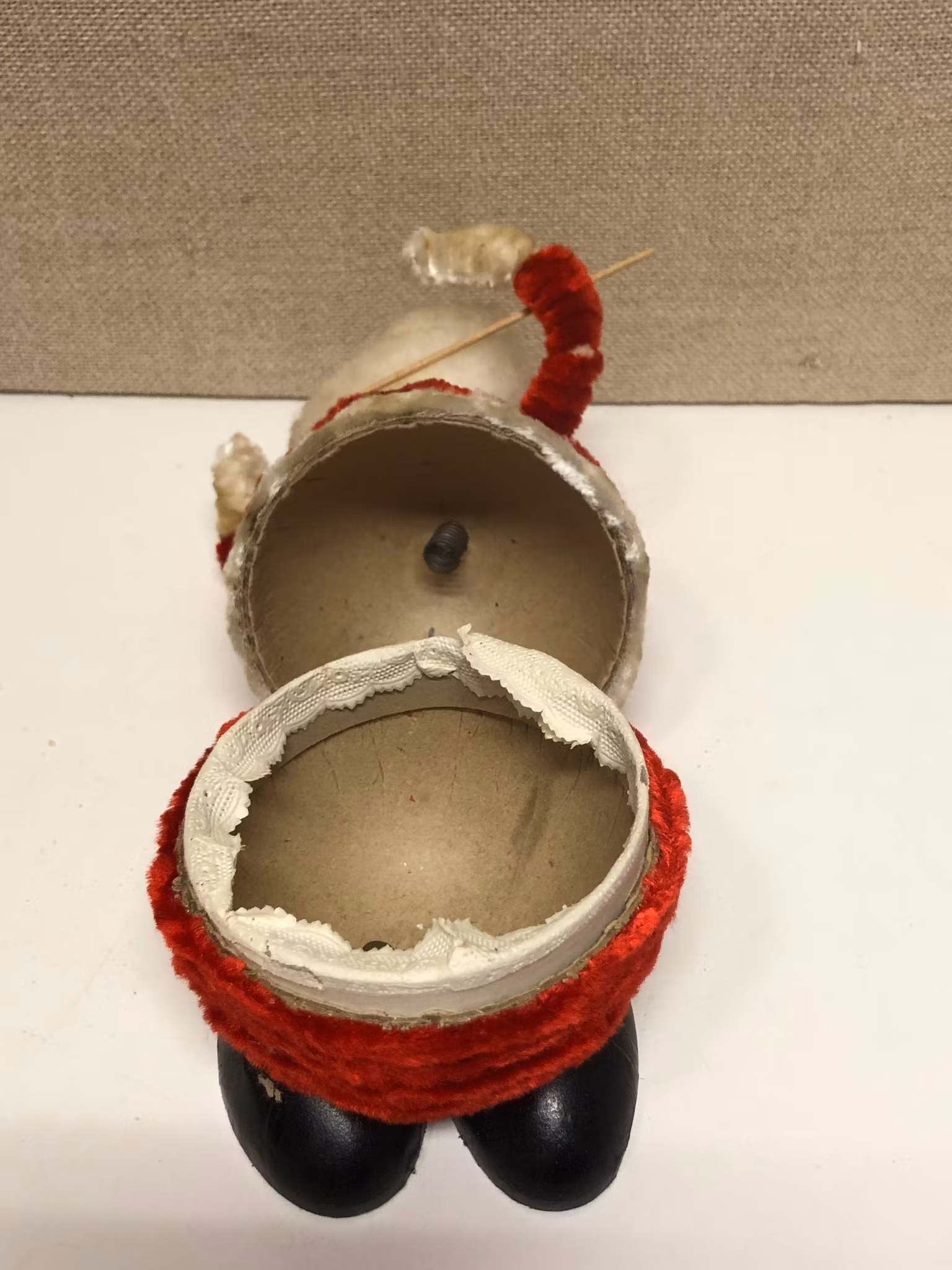 Tomte med gömma, kropp i kartong klädd med piprensare, vikbart huvud.