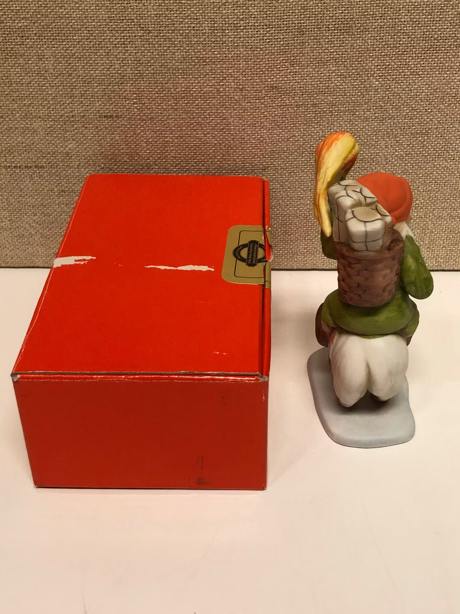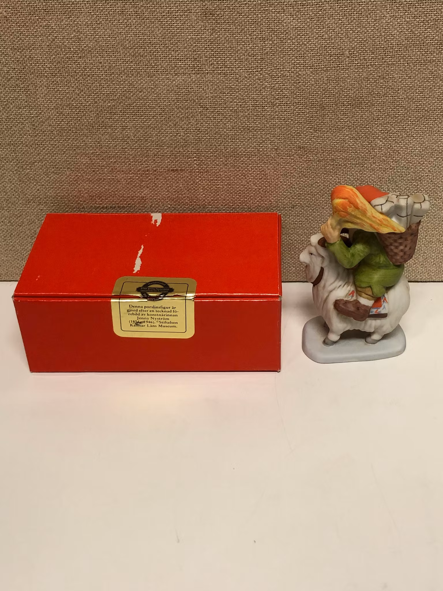 Figurin tomte & bock porslin i originalkartong märkt med nr. 312409, stämplad efter tecknad förebild av Jenny Nyström 1854-1946 Kalmar länsmuseum.