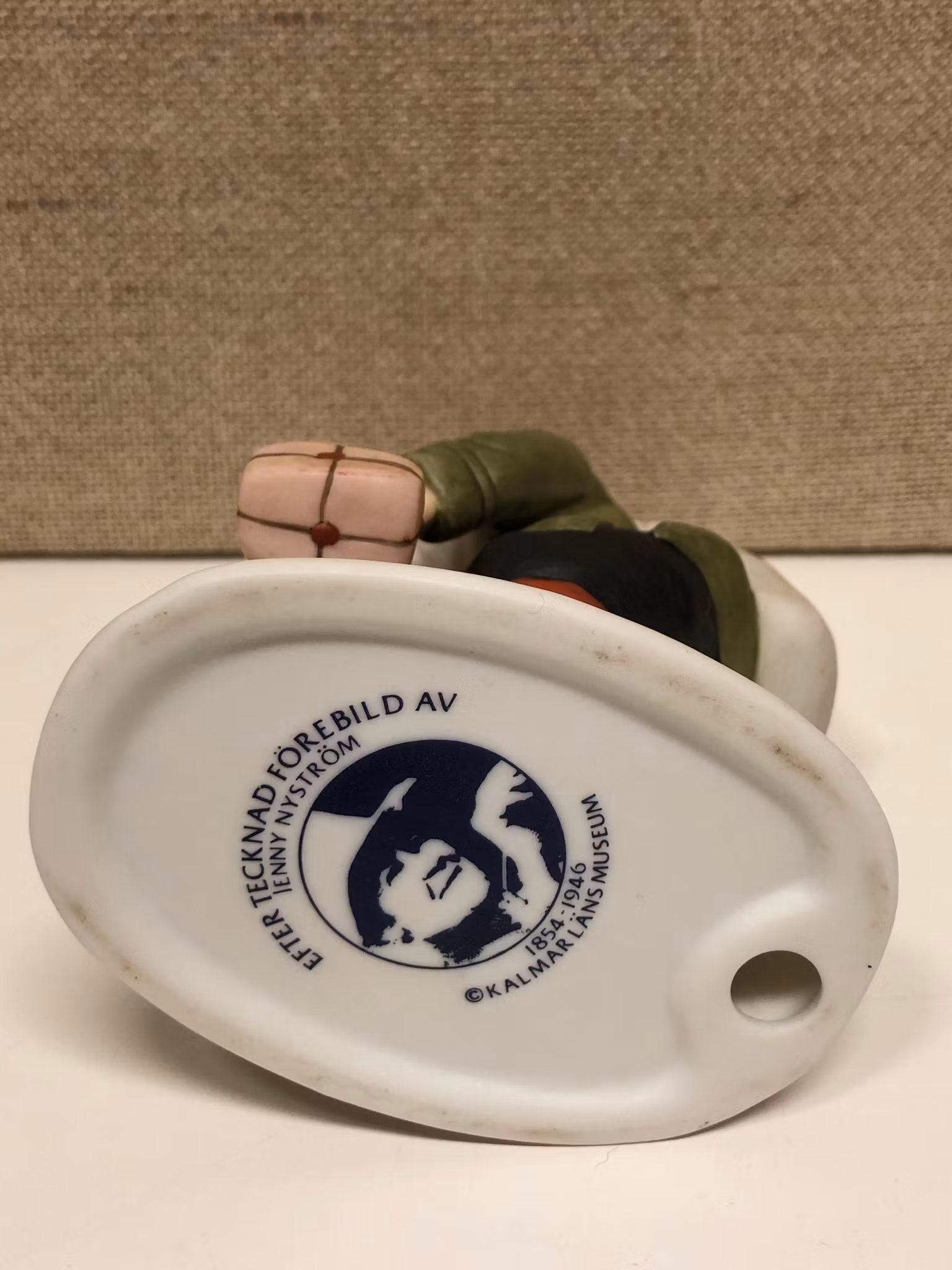 Figurin tomte med barn porslin, stämplad efter tecknad förebild av Jenny Nyström 1854-1946 Kalmar länsmuseum.