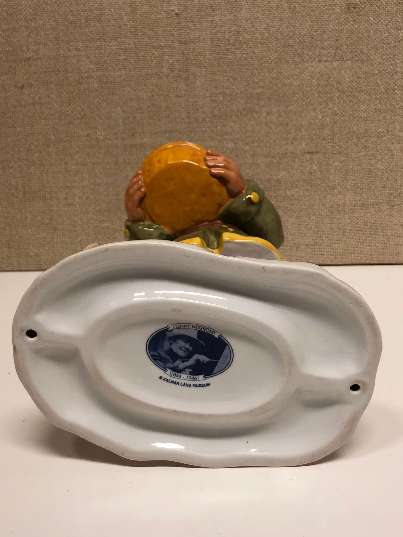 Figurin tomte med duva porslin, stämplad efter tecknad förebild av Jenny Nyström 1854-1946 Kalmar länsmuseum.