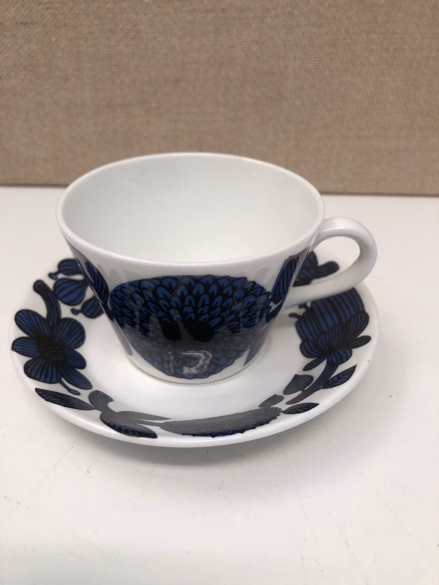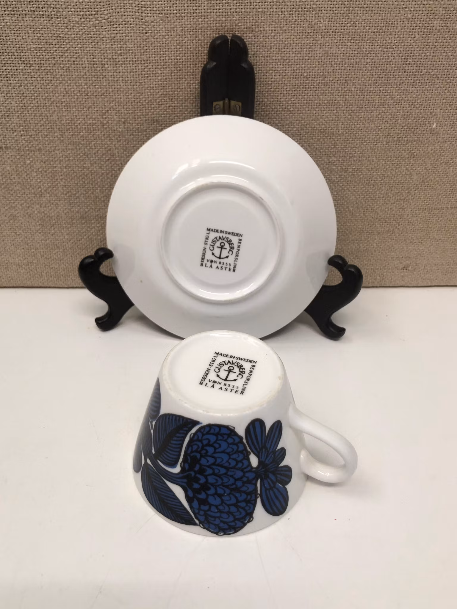Kaffekopp med fat, märkt design Stig L. made in Sweden benporslin Blå Aster Gustavsberg.