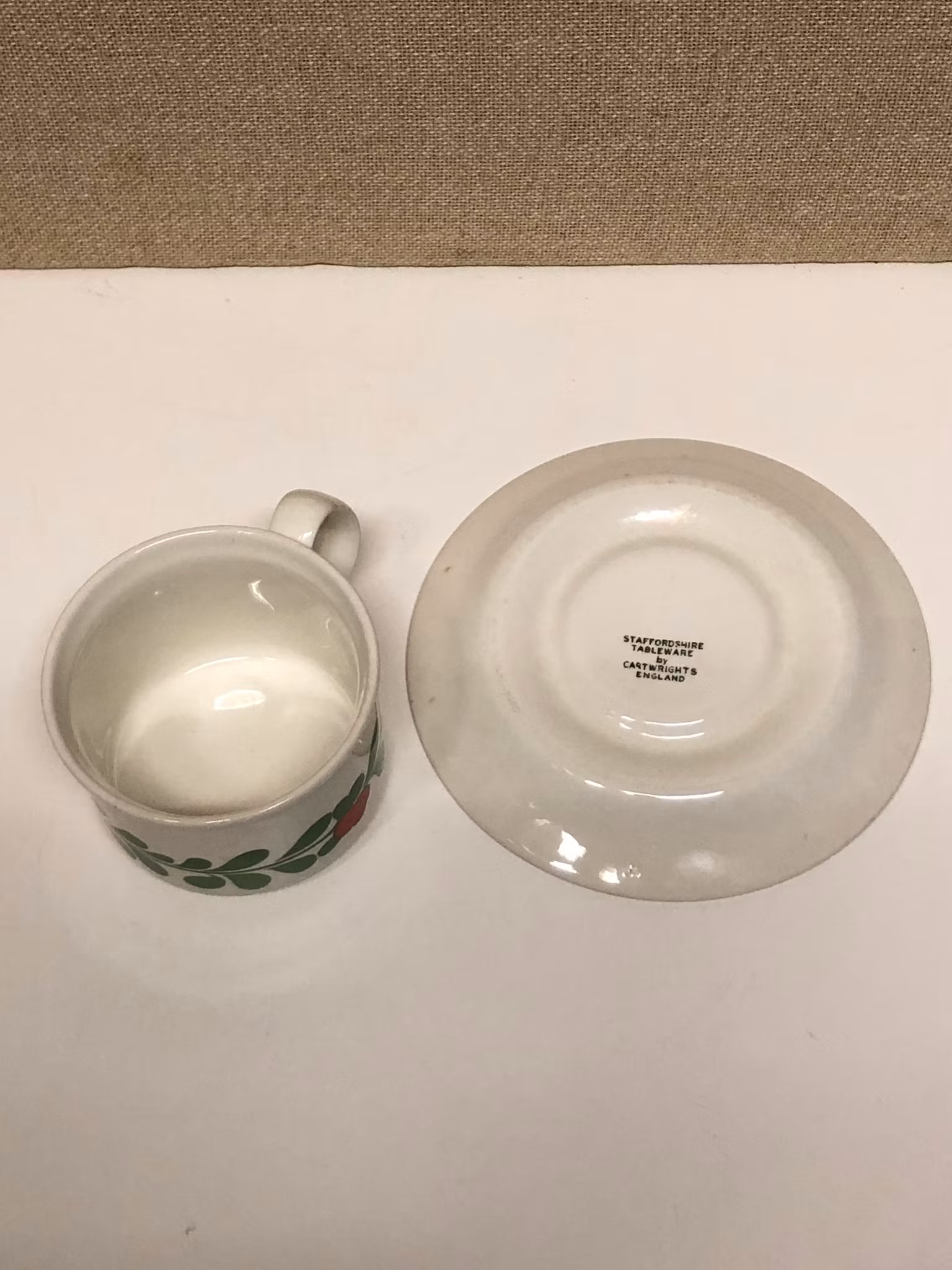 Tekopp med fat märkt Cartwrights of England Staffordshire tableware.