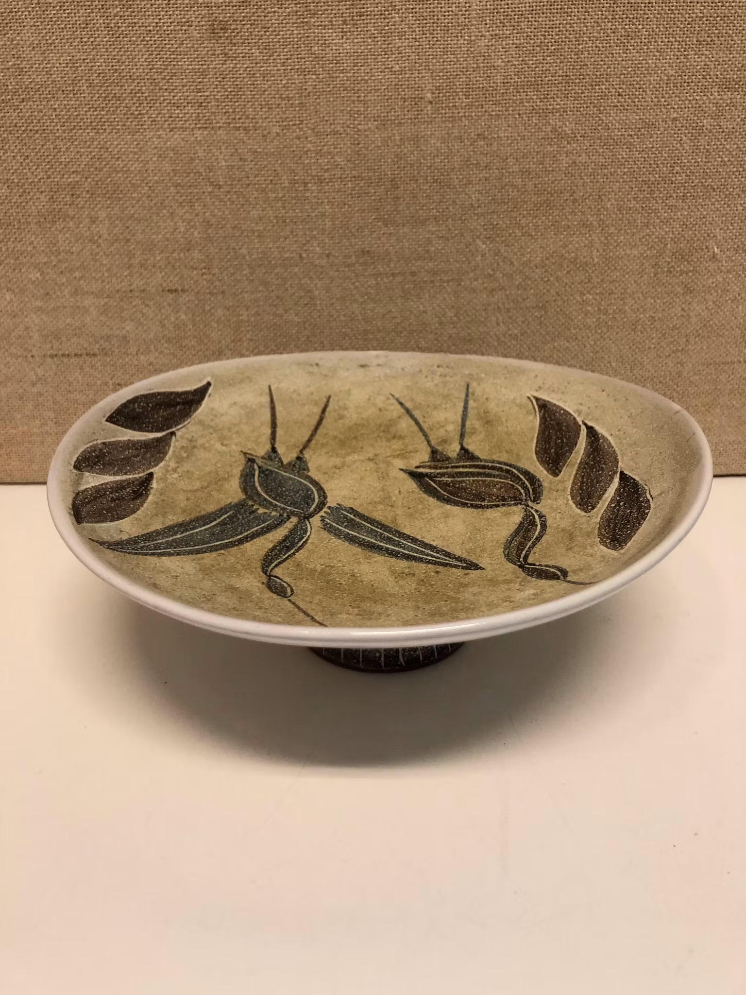 Skål på fot i keramik, otydlig stämpel Laholms Keramik.