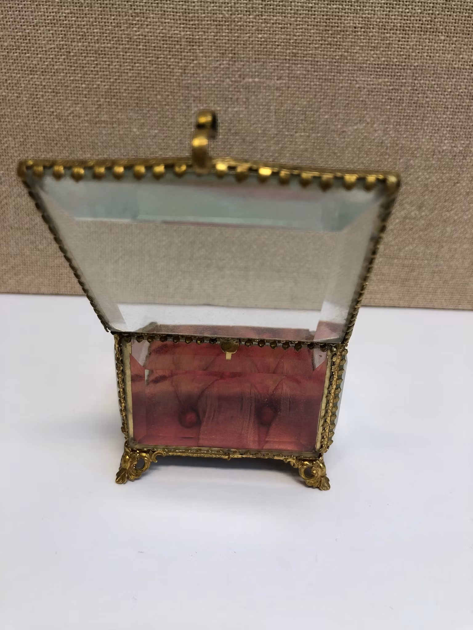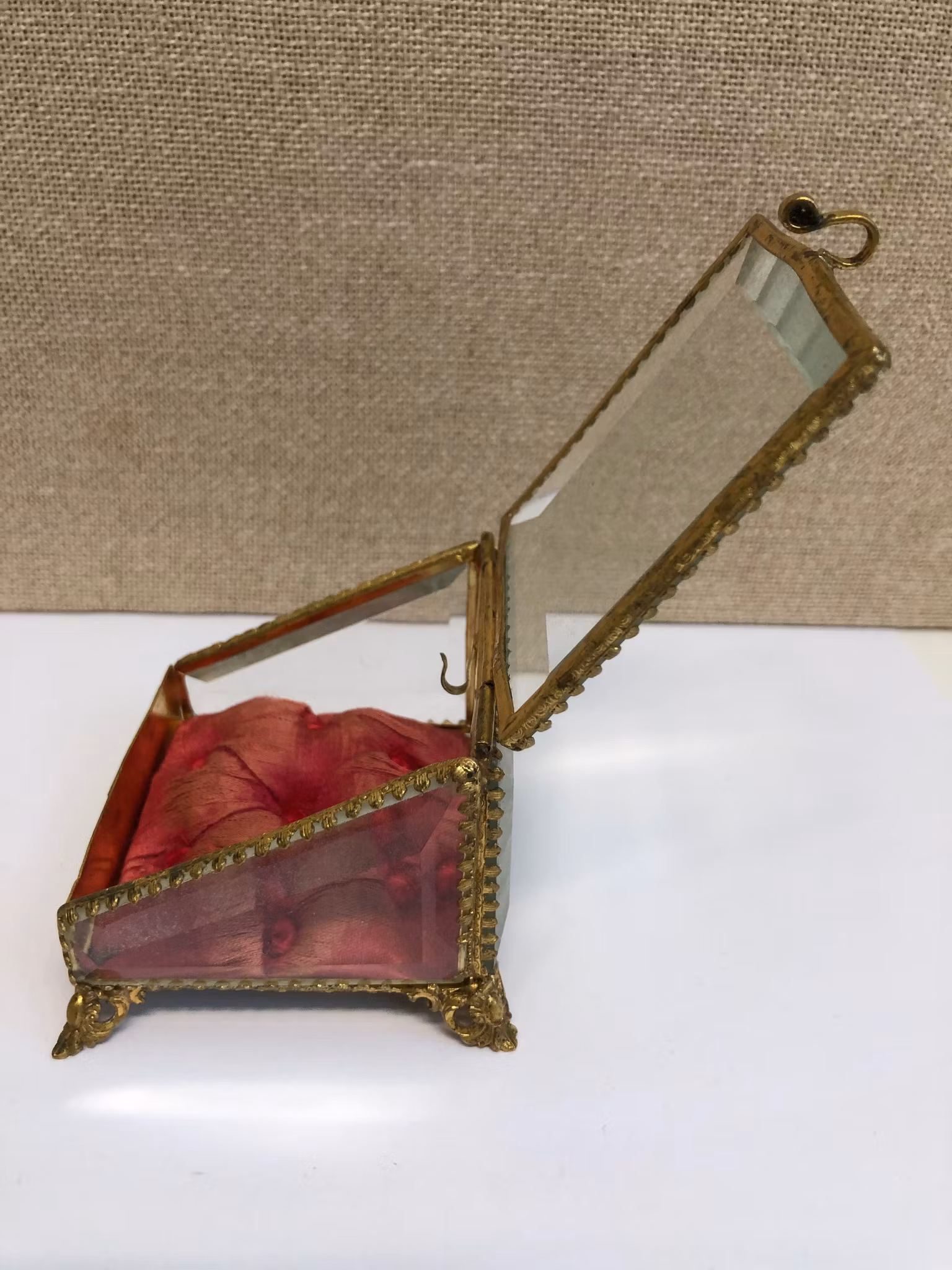 Klockgömma med stomme i förgylld metall, slipat glas samt textil invändigt.