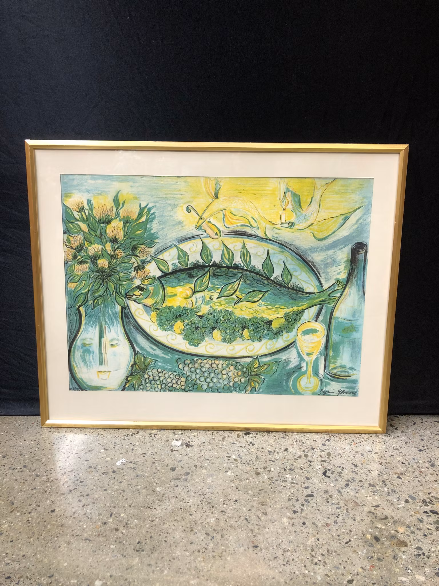 Stilleben med fisk, inglasad. Bildmått ca. 61 x 45 cm, rammått 74 x 59,5 cm.