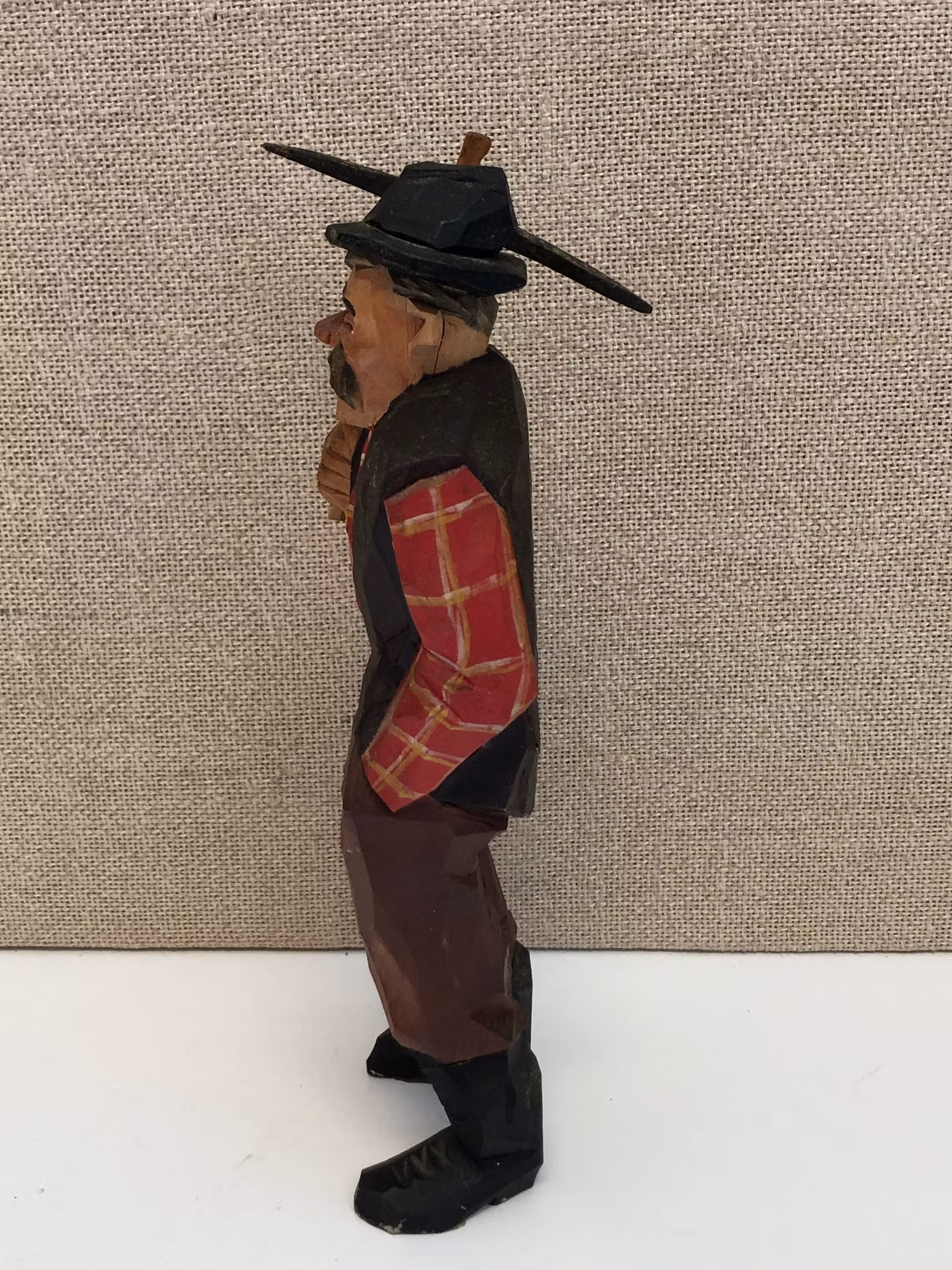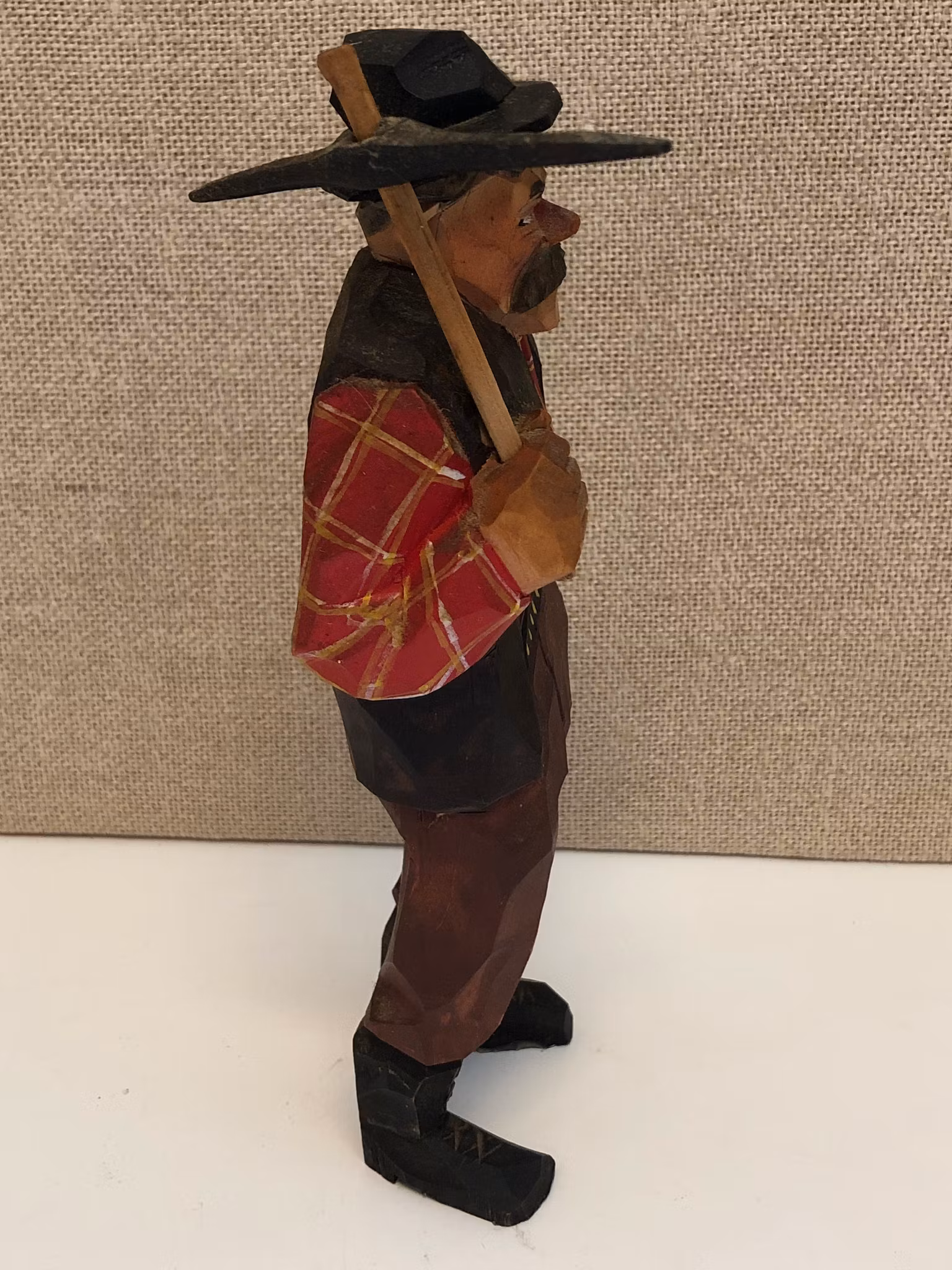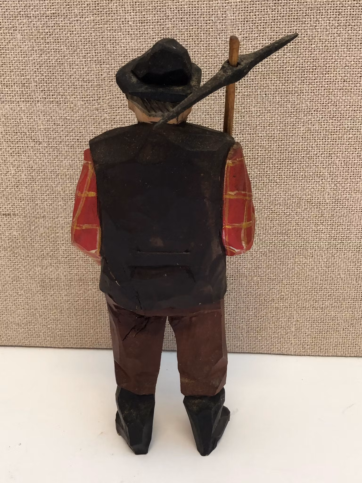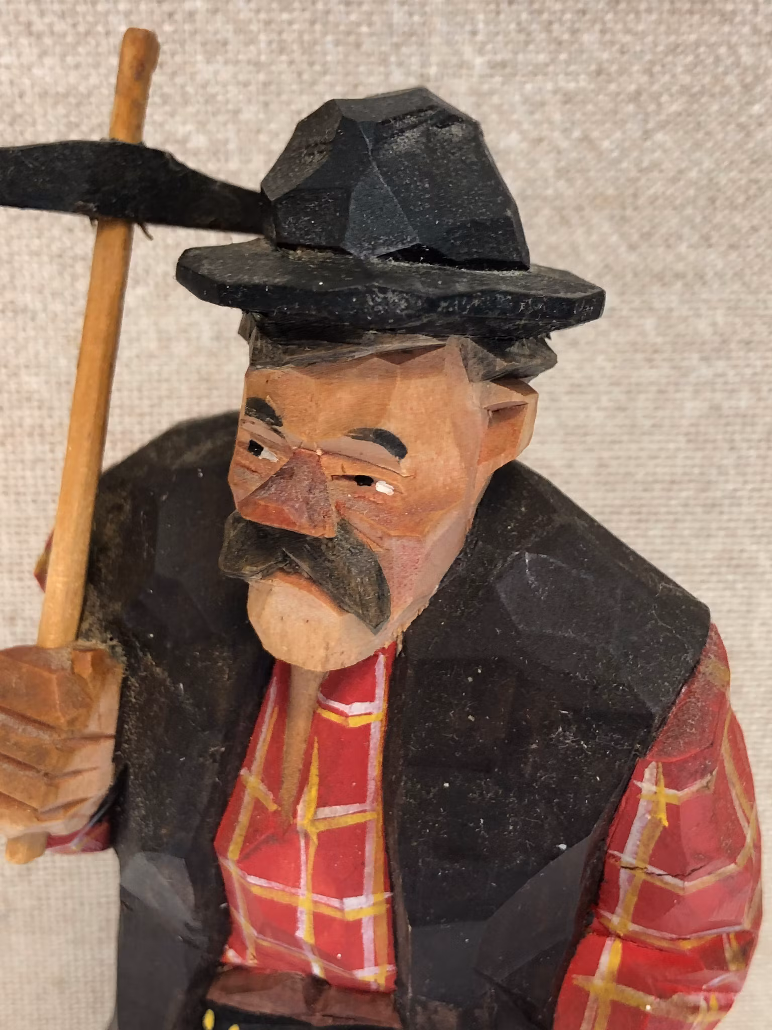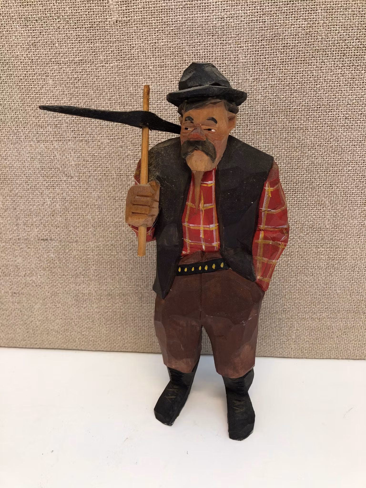 Skulptur i trä av en bergsman, kan ha stått på en fotplatta.