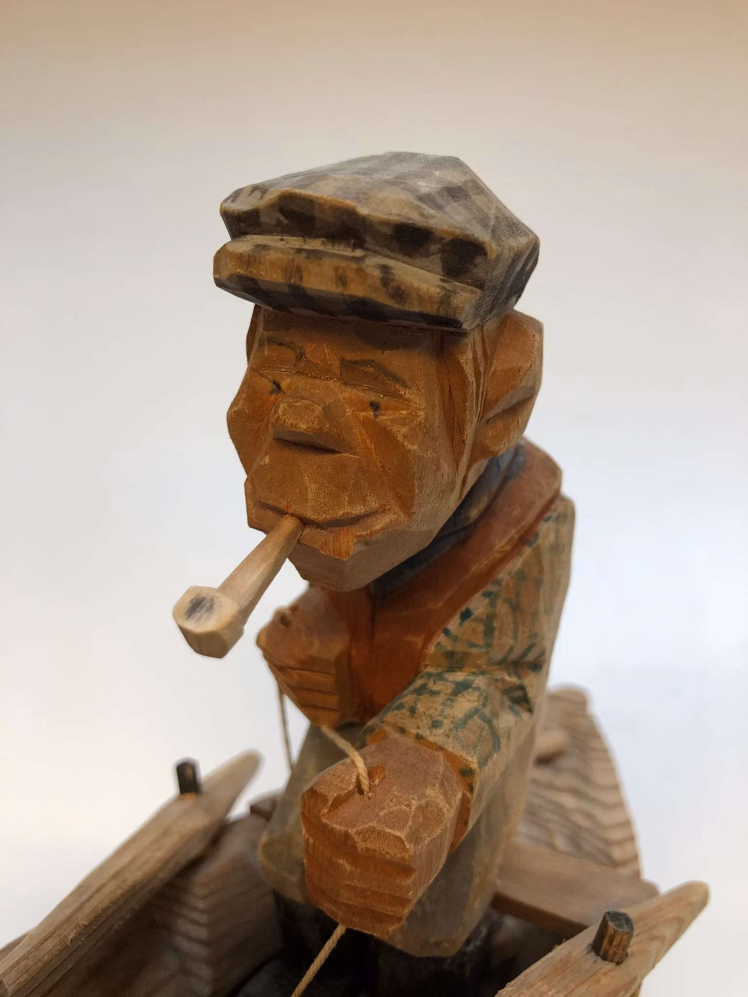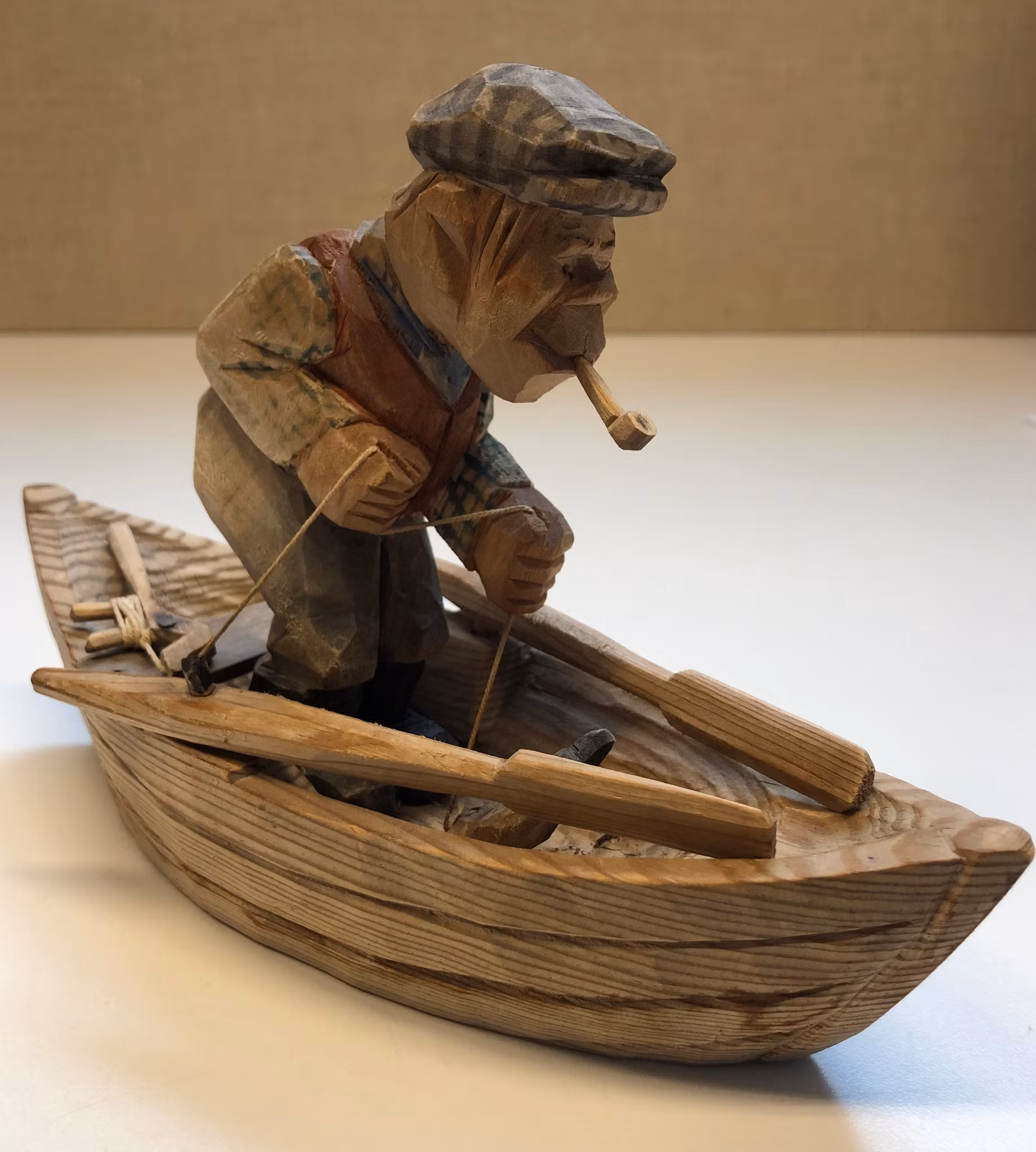 Träskulptur fiskare i båt monogram signerad GH samt daterad 1958.