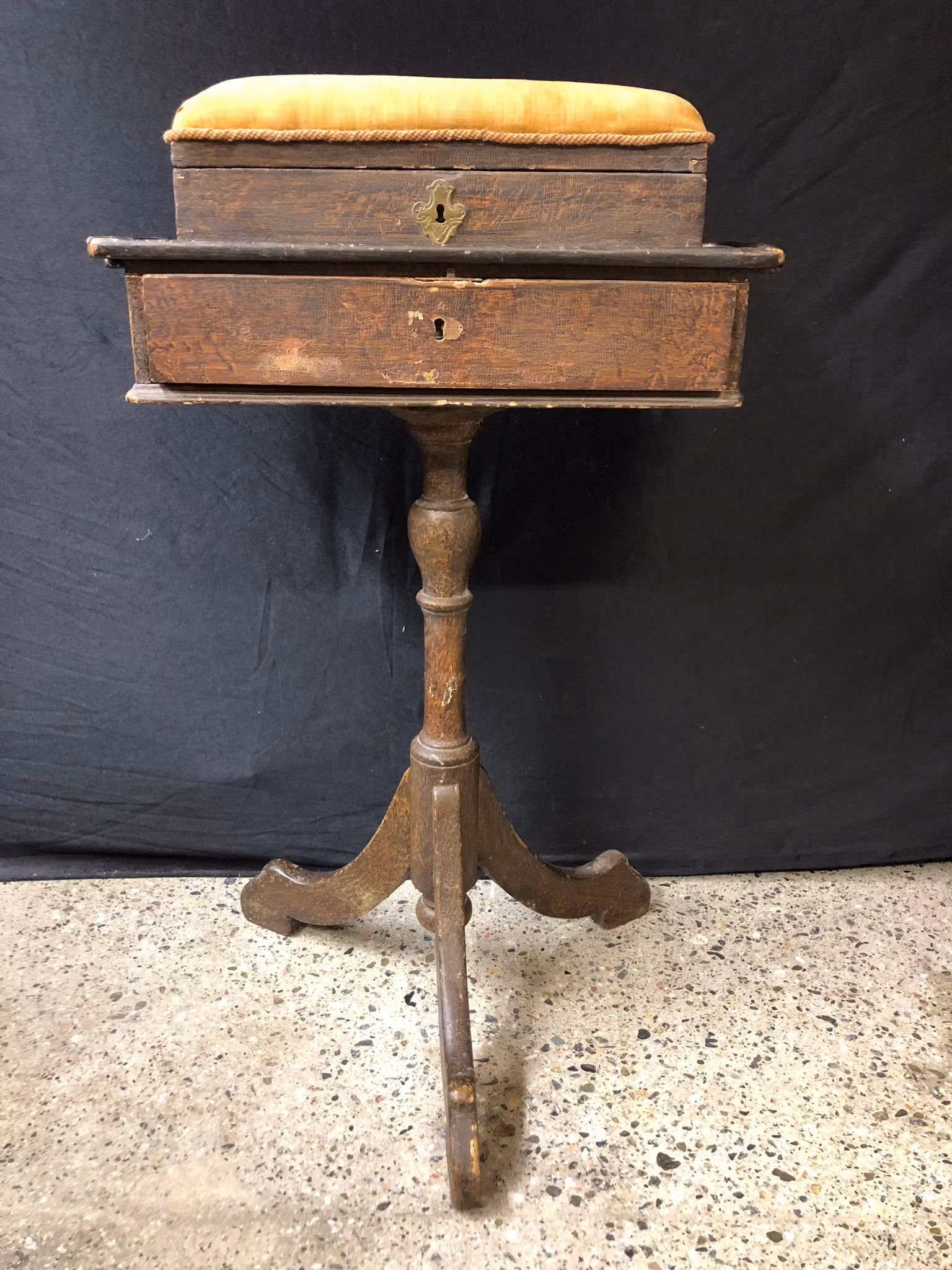 Åldersrelaterat slitage, ommålat på 18/1900-talet, ett beslag samt nyckel saknas.