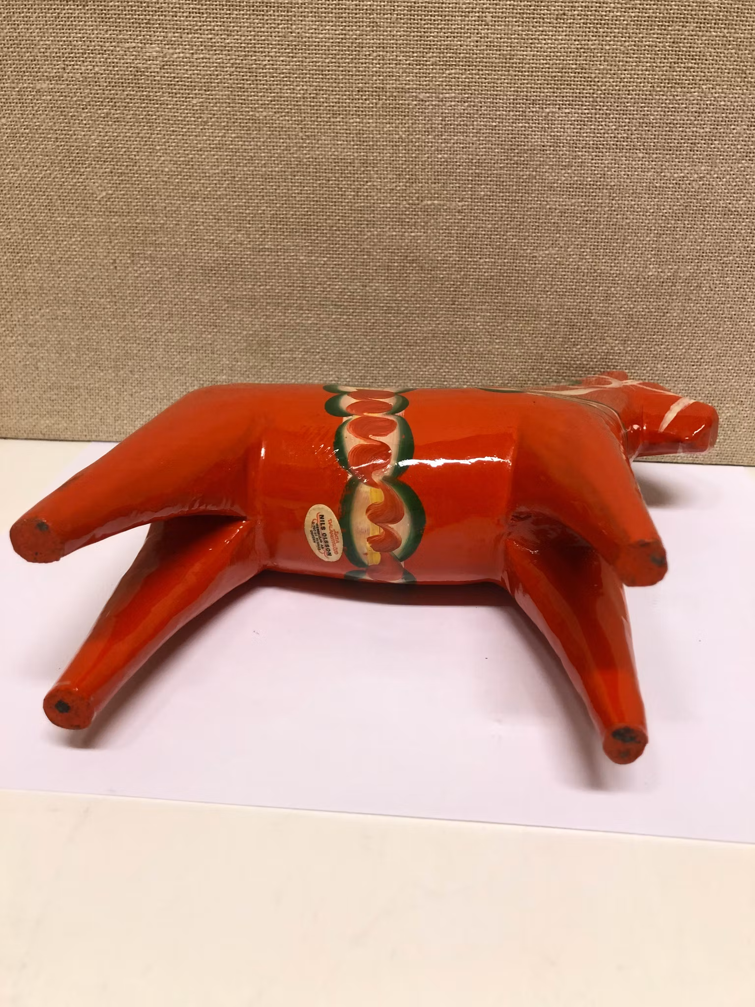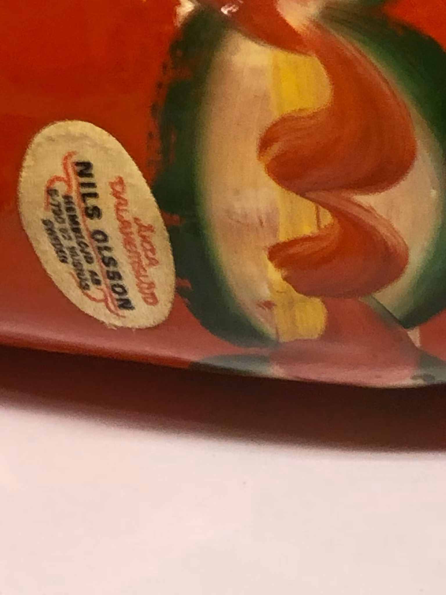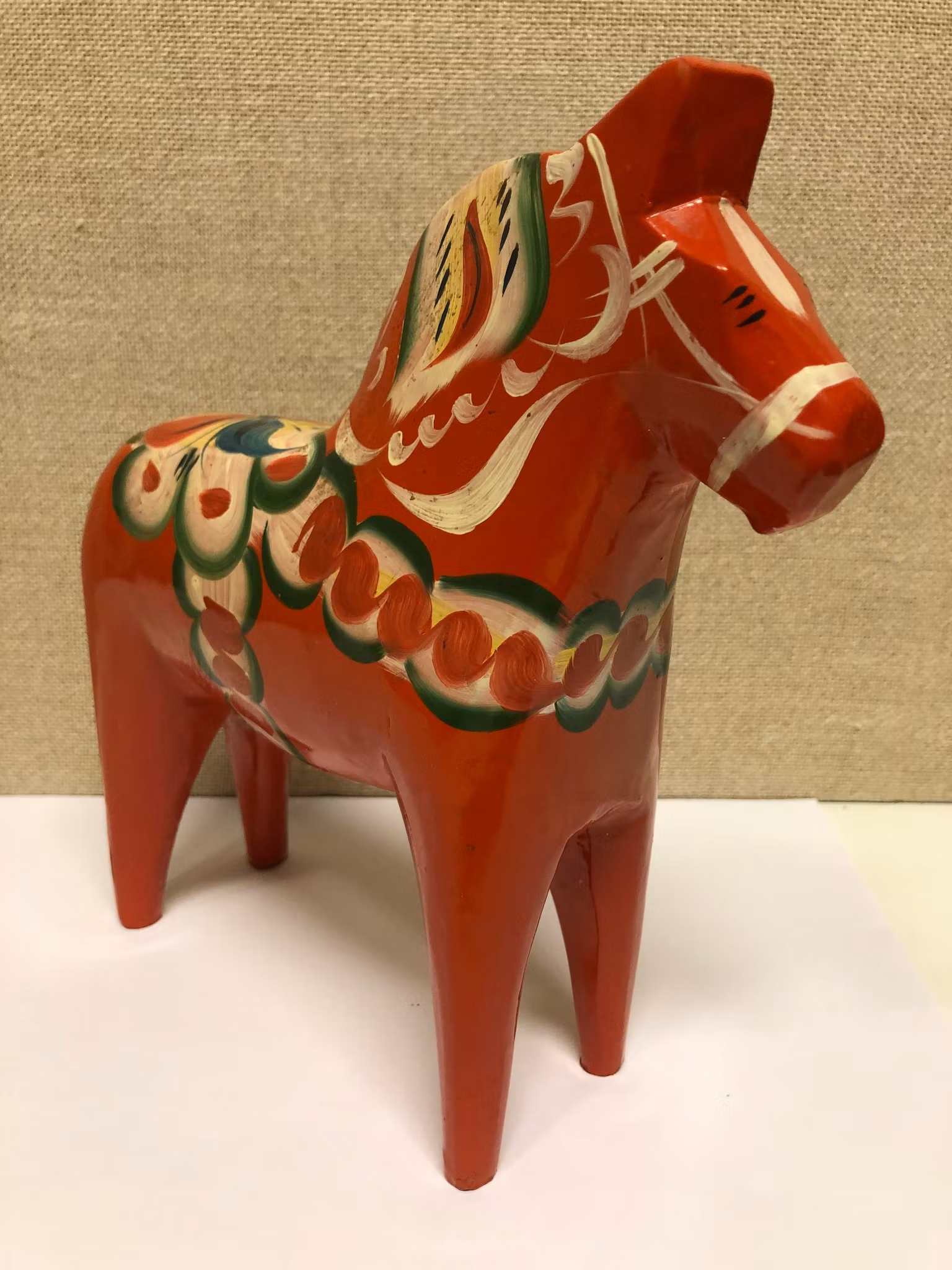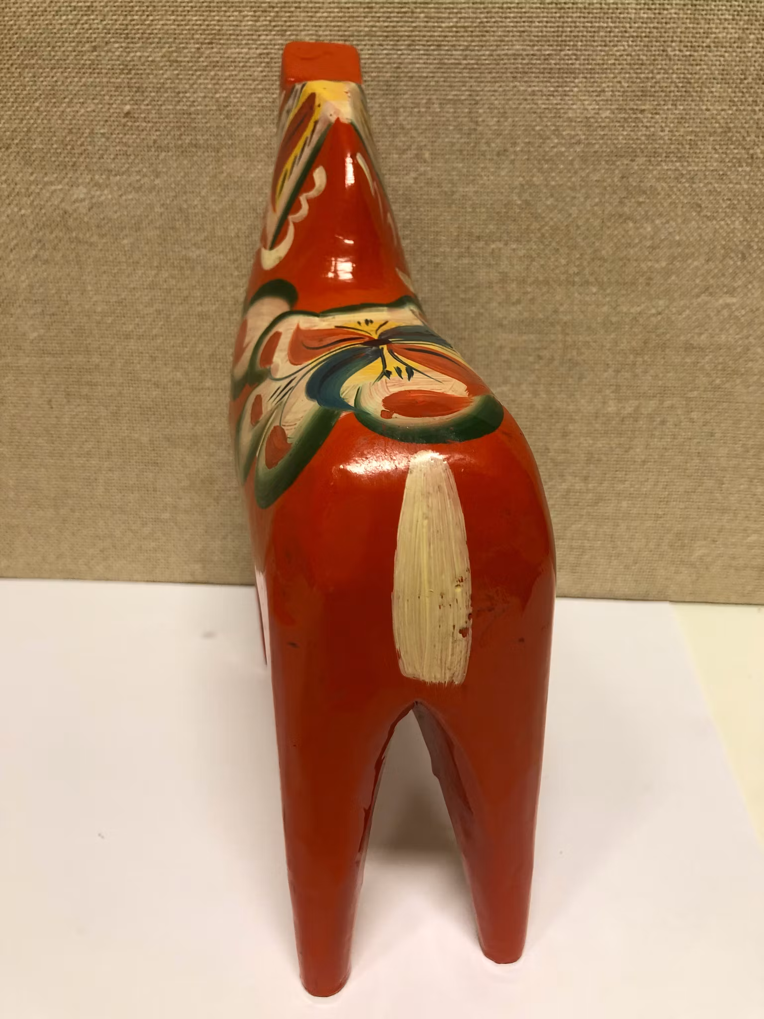 Dalahäst i trä, etikettmärkt Äkta Dalahemslöjd Nils Olsson Hemslöjd AB Nusnäs Mora Sweden.