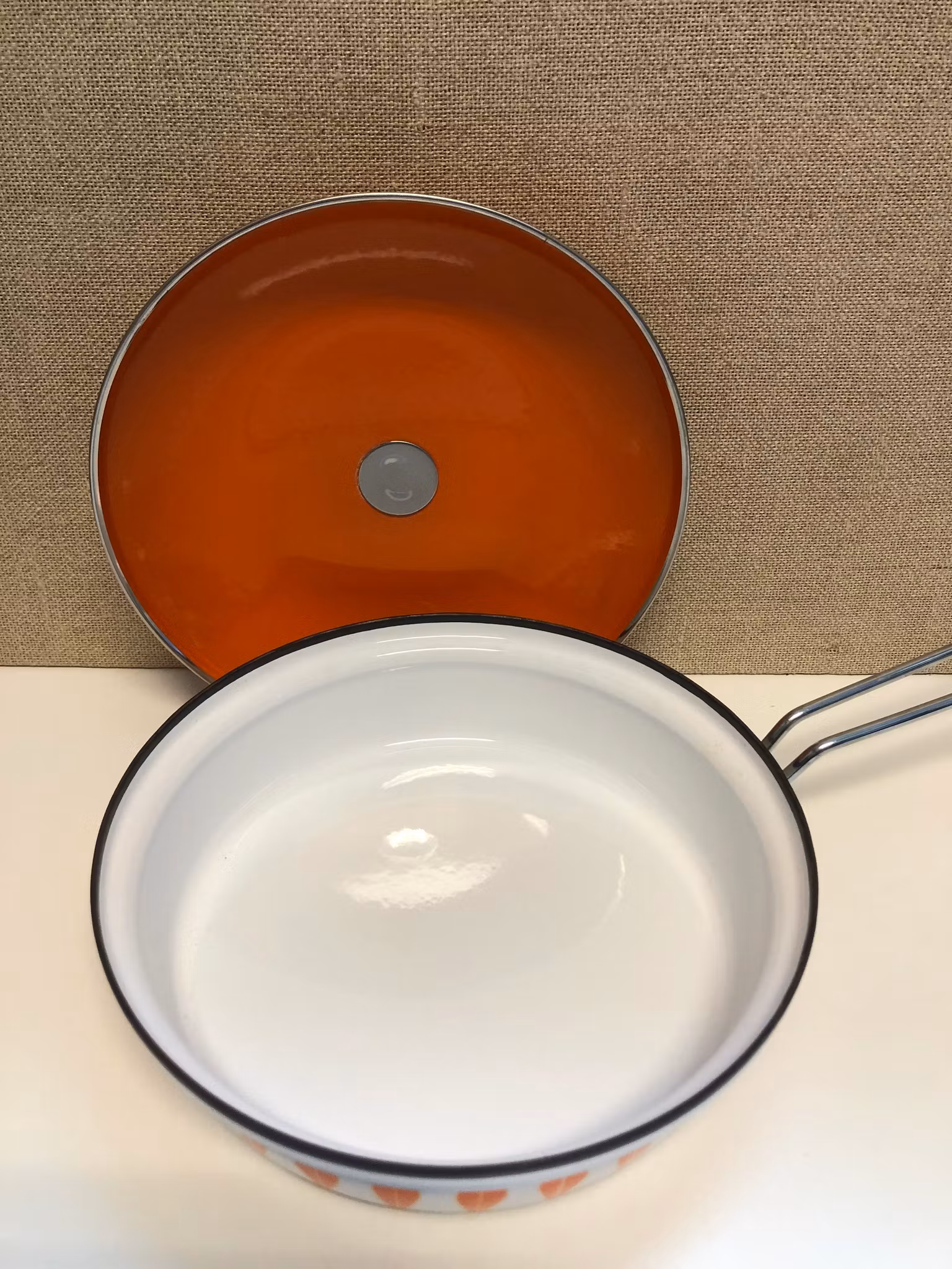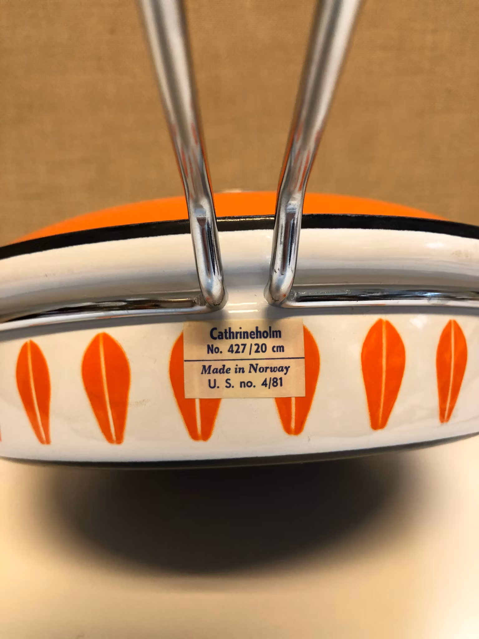 Kastrull med lock märkt med etikett Cathrineholm No. 427/20 cm, Made in Norway U.S no. 4/81.