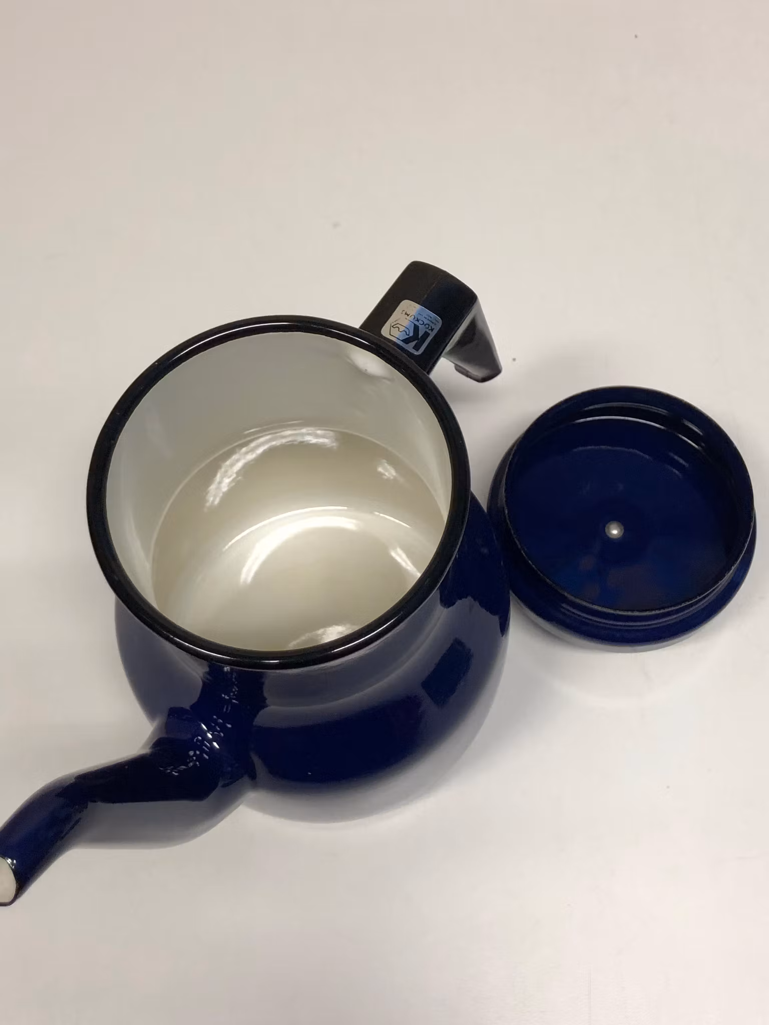 Kaffepanna i emaljerad metall etikettmärkt Kockums Sweden.