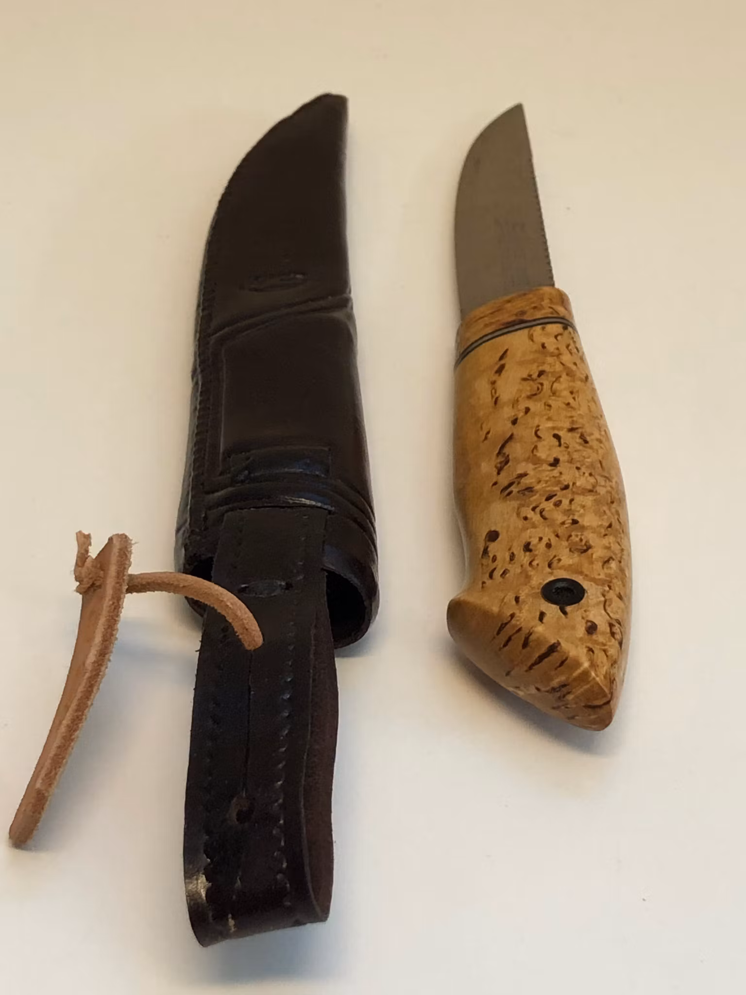 Kniv Sören Norberg Njurunda, skaft i björkrot, blad Frost stainless Mora Sweden, slida i läder signerad SN G 28.