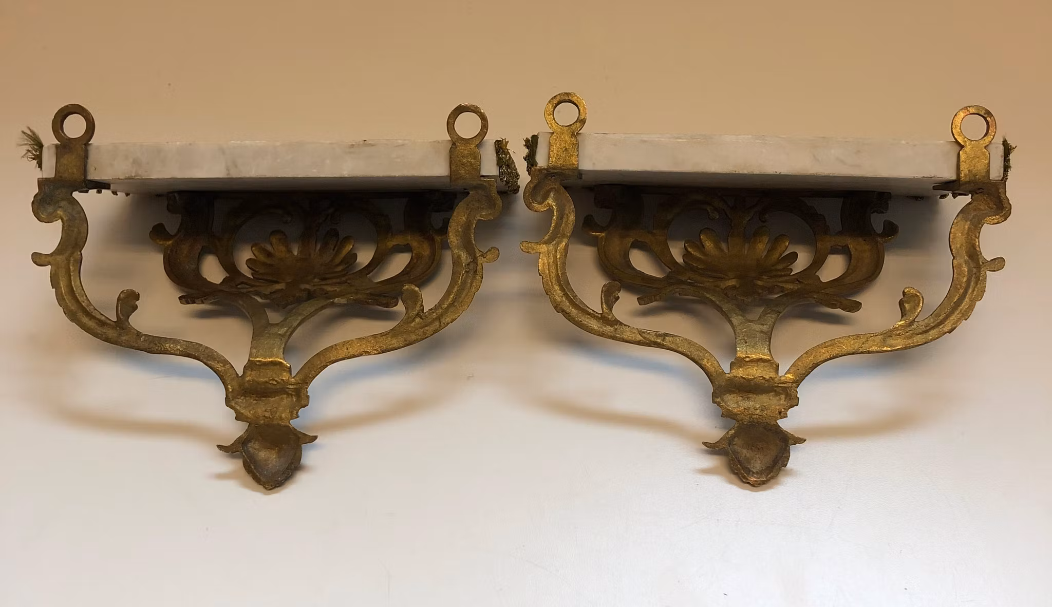 Vägghyllor med marmorskiva samt förgylld mässing.