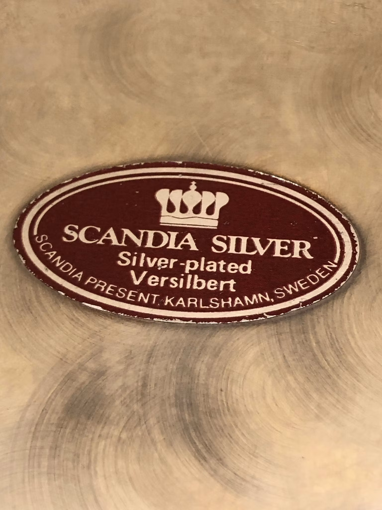 Bricka märkt me d etikett Scandia Present Karlshamn Sweden silver-plated versibert.
