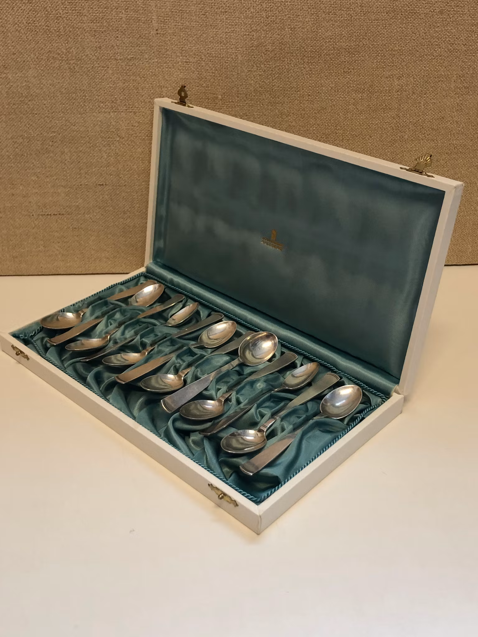 12 st. kaffeskedar silver med etui, stämplade GAB Ortsstämpel kattfot S S9 (1968) samt U9 (1970).