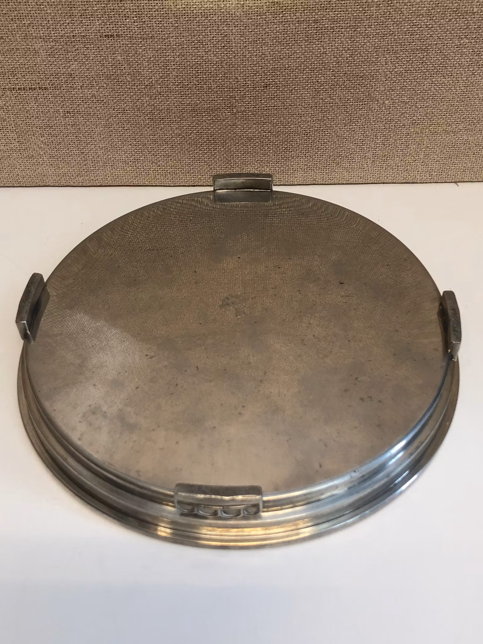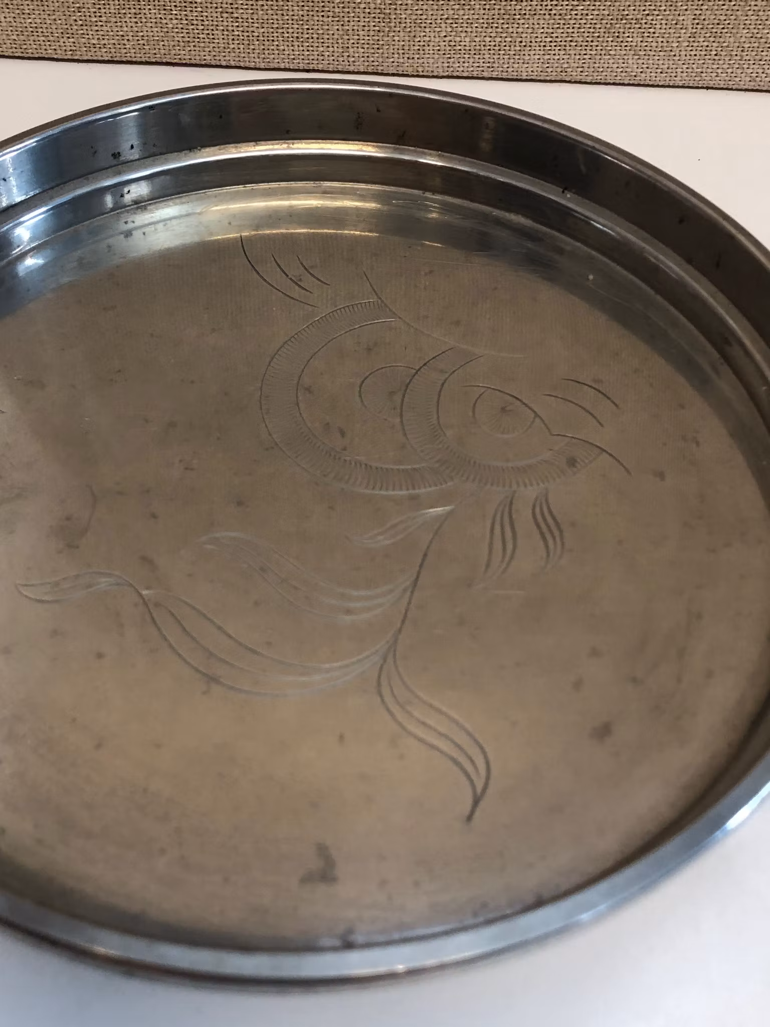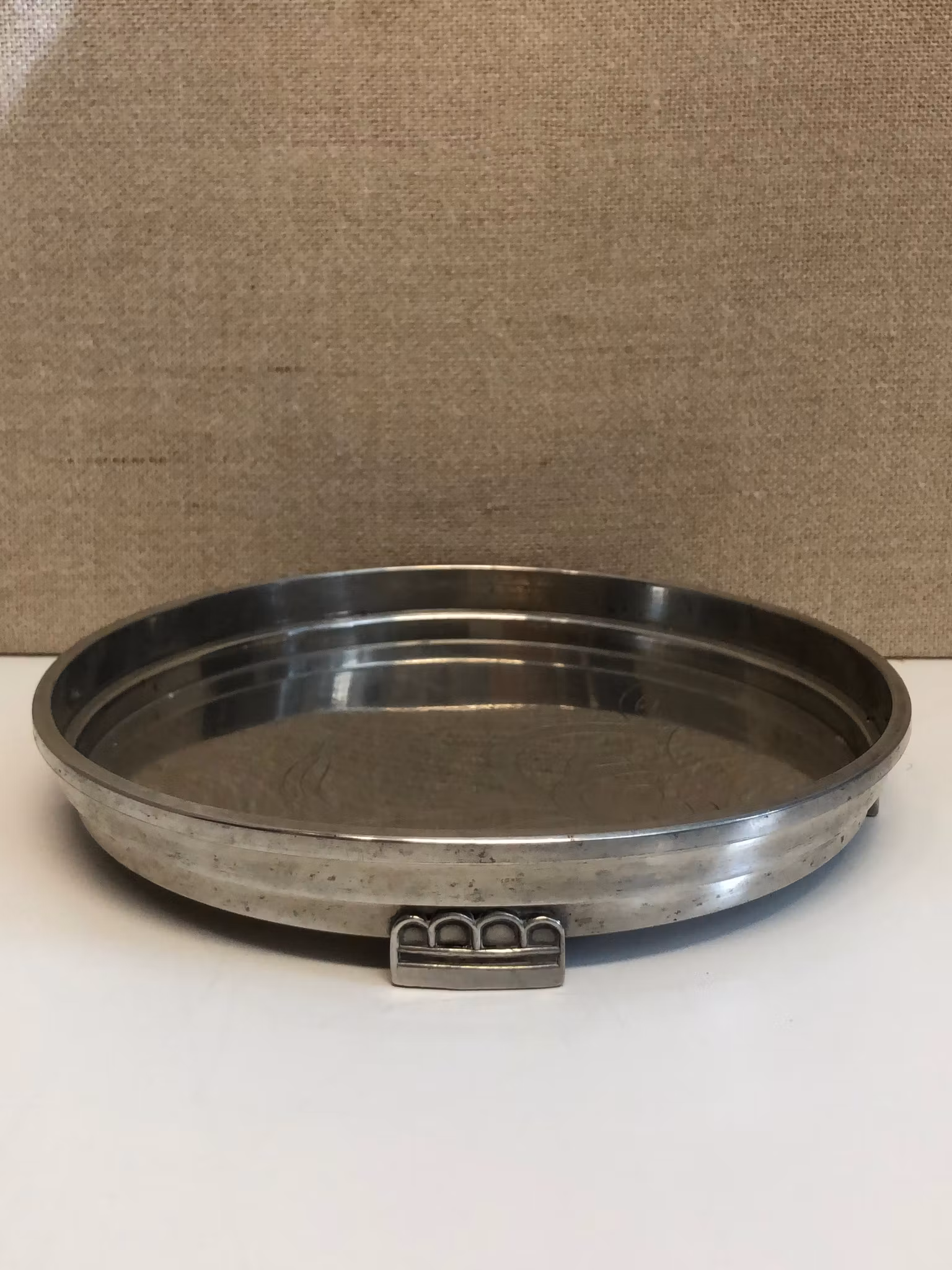 Bricka i tenn med graverat mönster, stämplad K.E. Co. Svenskt Tenn E H8=1934.